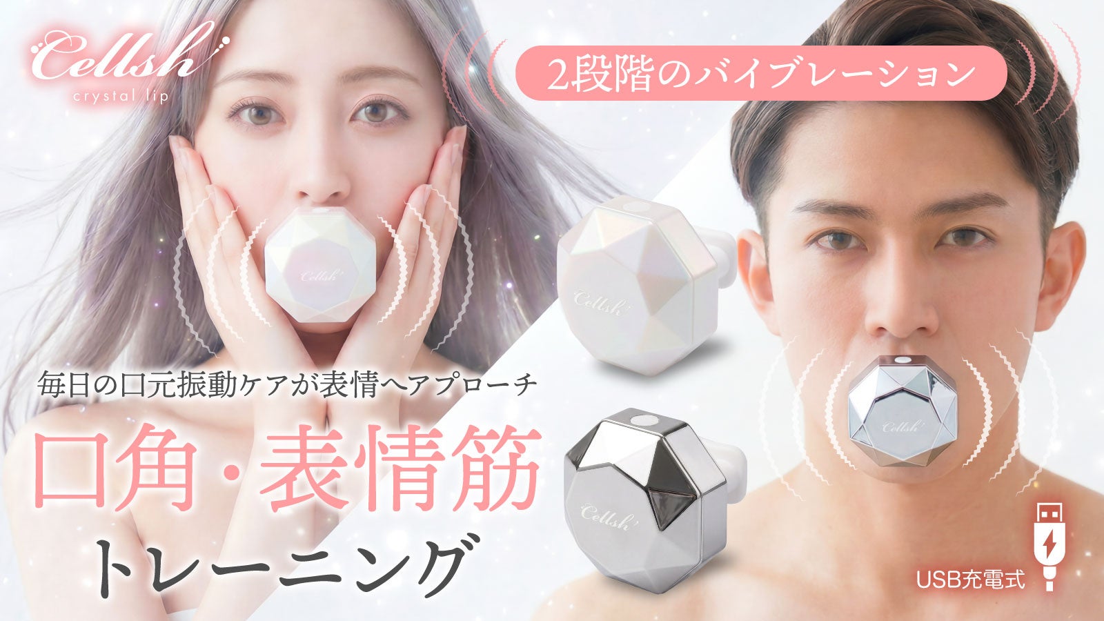 「Cellsh クリスタルリップ」は、唇でくわえて振動させることで口元まわりの筋肉を心地よく刺激する新発想のフェイスエクササイズアイテムです。