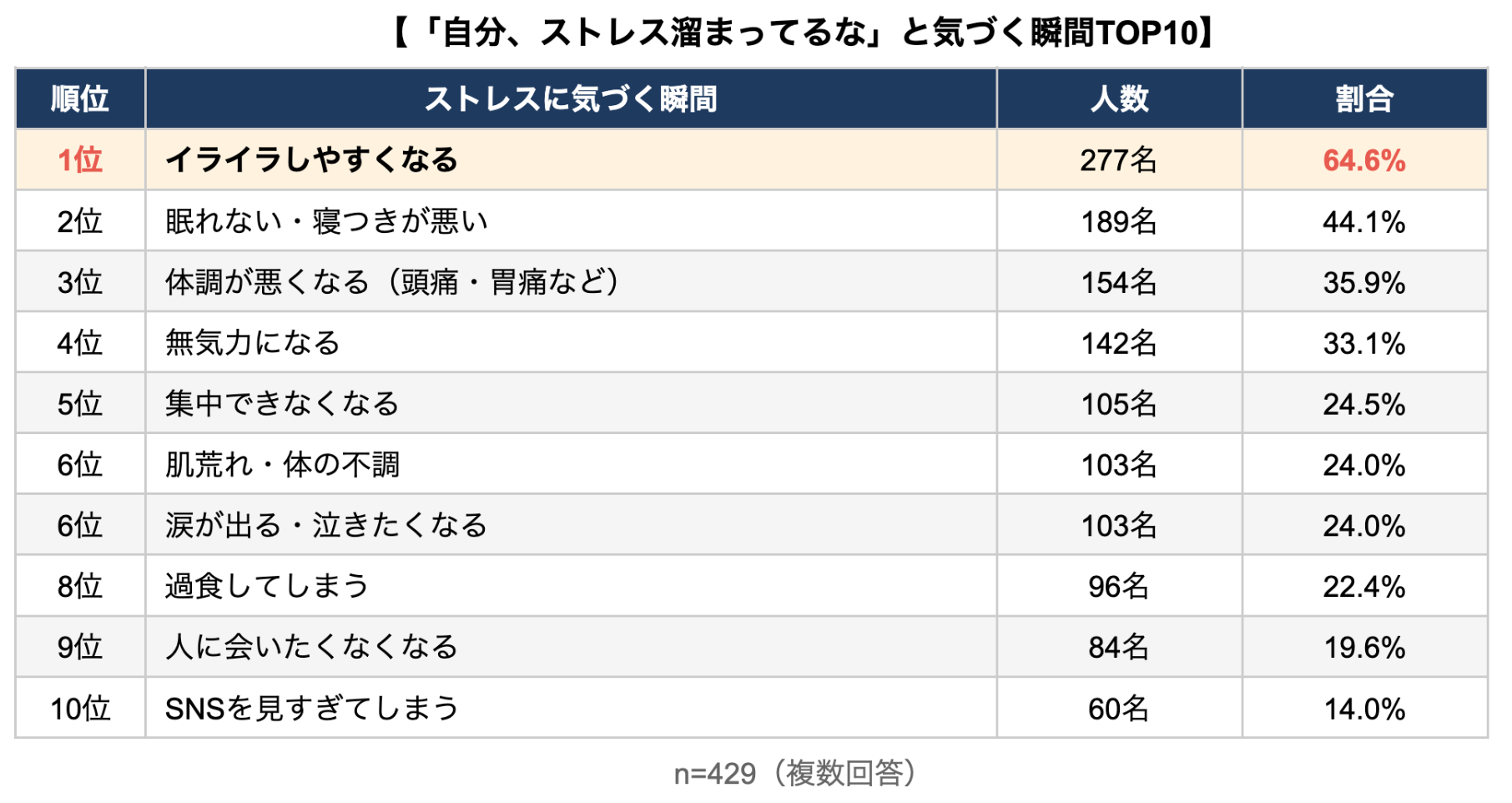 また、「過食」(8位)や「SNSを見すぎる」(10位)といった行動の変化もストレスサインとして認識されています。