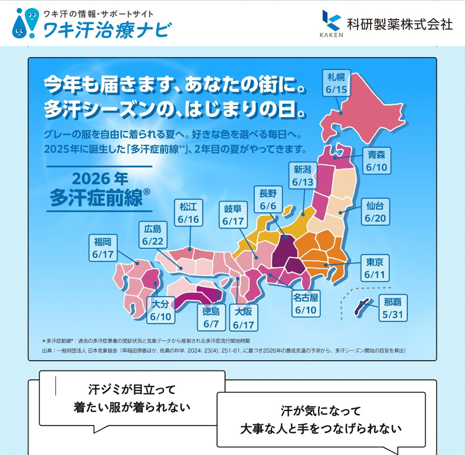 科研製薬株式会社(本社:東京都文京区、代表取締役社長:堀内 裕之、以下「科研製薬」)は、一般財団法人 日本気象協会(本社:東京都豊島区、理事長:渡邊 一洋、以下「日本気象協会」)と共同で作成した「多汗症前線®2026」をワキ汗の情報・サポートサイト「ワキ汗治療ナビ」に本日公開しましたのでお知らせいたします。
