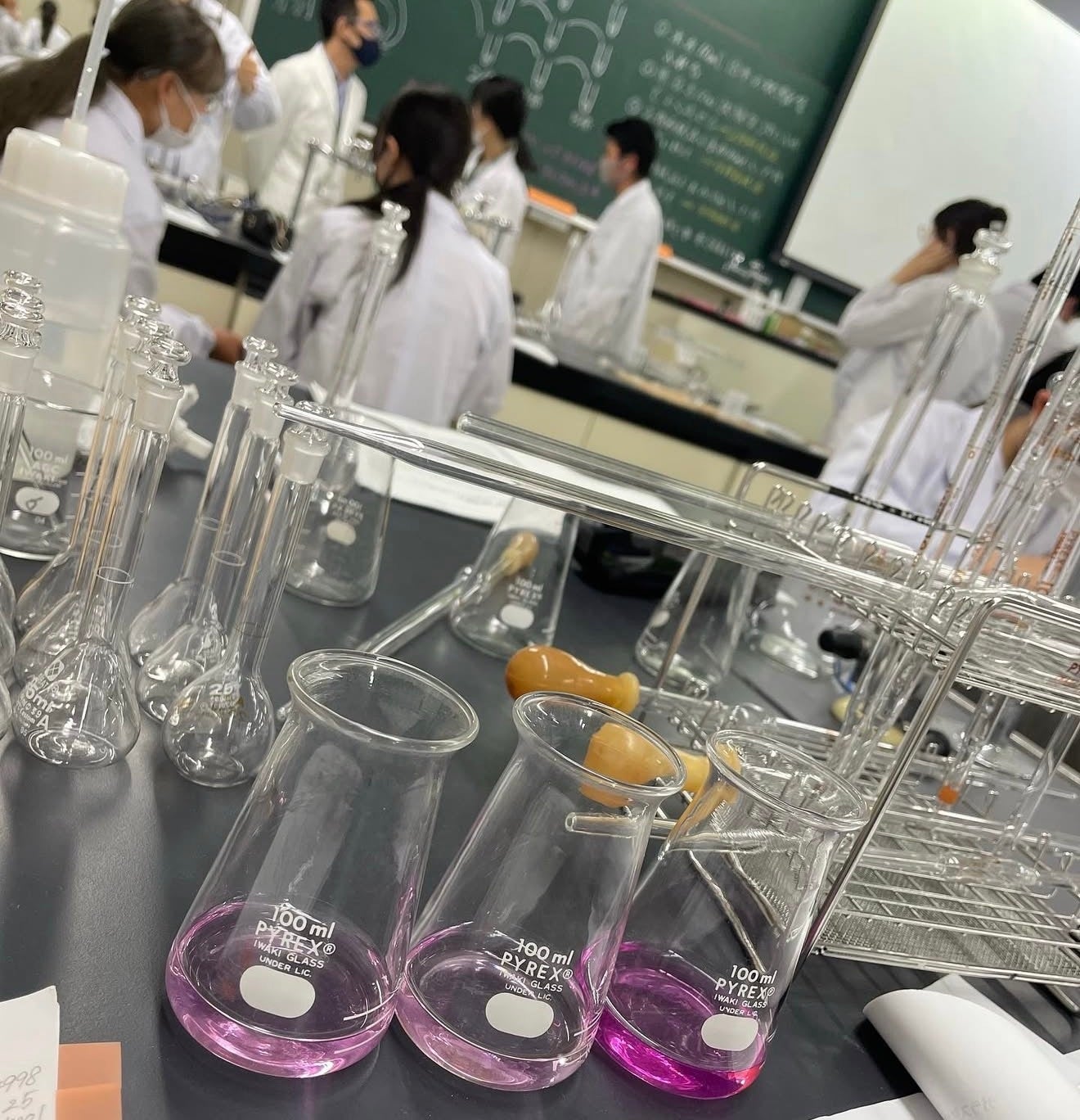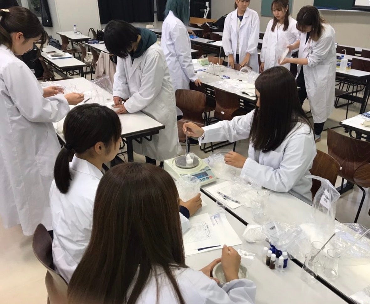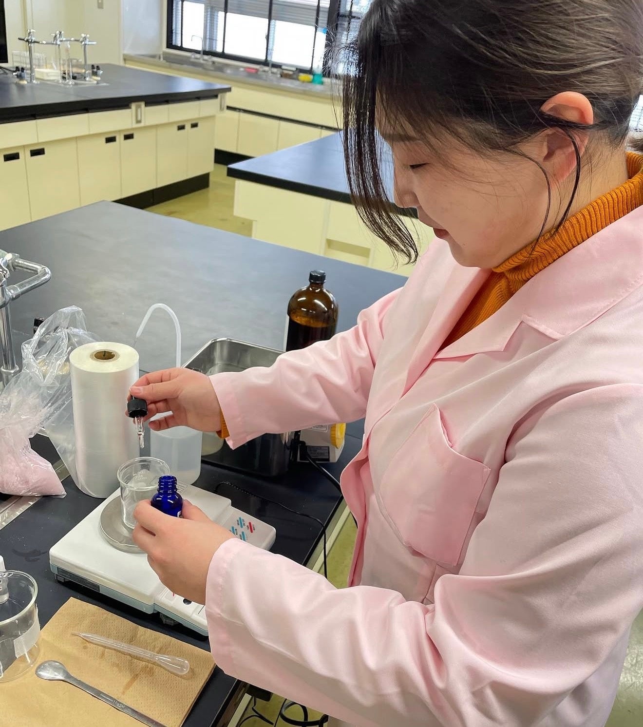 細胞試験を行うバイオ実験室から、香りを分析する精密機器、実際にクリームやローションを試作する製剤実習まで、企業の研究職に近い環境で学生たちはスキルを磨いています。