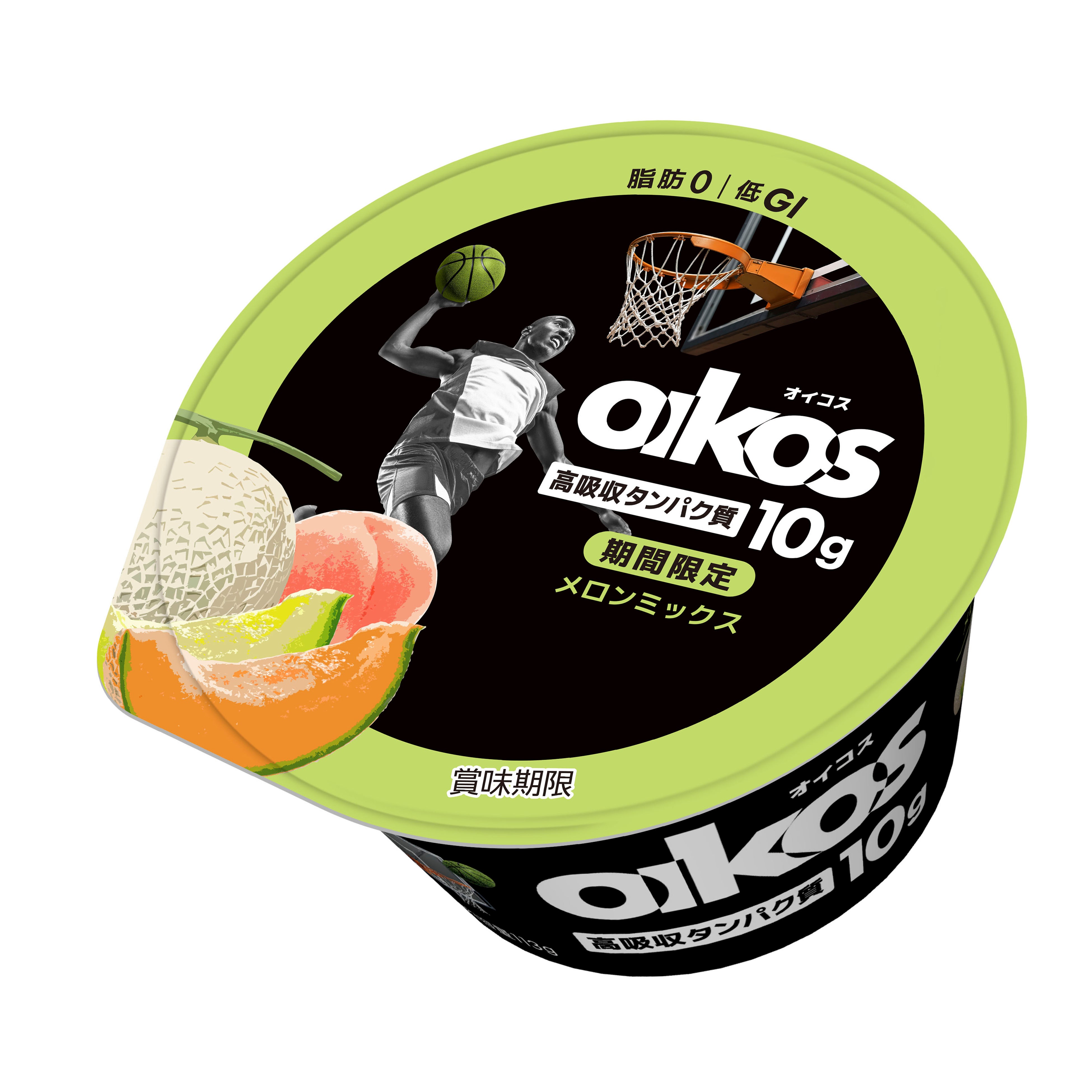 パッケージには、本製品の特長である2種類のメロンと桃に加え、バスケットボールをモチーフにしたイラストをデザイン。華やかさと力強さを両立した、オイコスらしいエネルギッシュな世界観を表現しました。