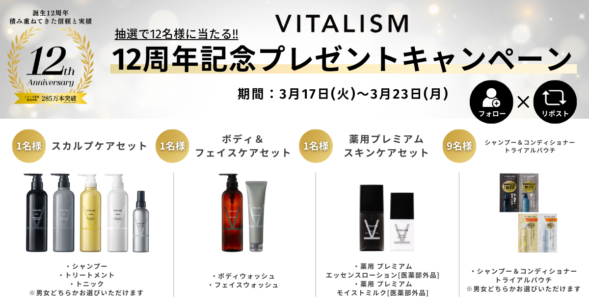株式会社ヘアジニアス・ラボラトリーズ(本社:東京都渋谷区、代表取締役:津田知明)が展開する、東京・表参道の頭皮ケアクリニックの思いから生まれたトータルケアブランド「VITALISM(バイタリズム)」は誕生12周年を迎えたことを記念し、公式Xにてプレゼントキャンペーンを実施いたします。