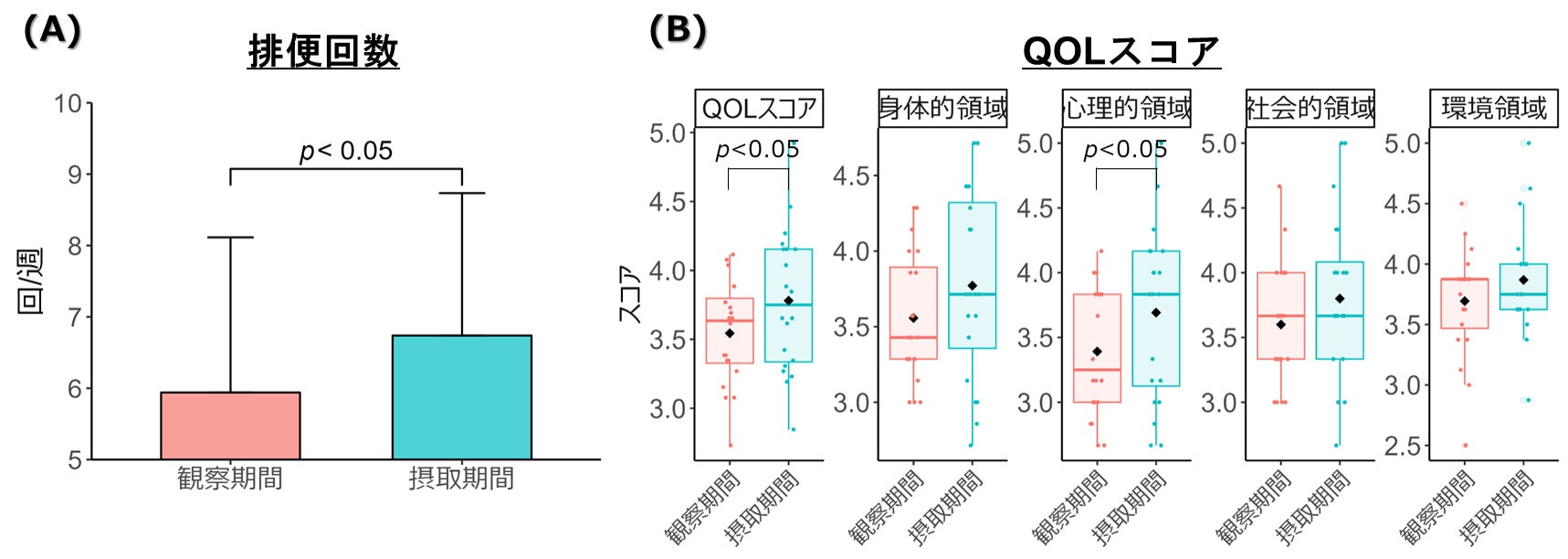 図 1. 大豆ヨーグルト摂取による排便回数及びQOLの変化                               4週間の大豆ヨーグルト摂取前後での排便回数の変化(A)及びQOLスコアの変化(B)を調べました。QOLは質問紙WHO-QOL26を用いて評価しました。結果、摂取前と比較して、排便回数の有意な向上、QOL全体スコア及び心理的領域のスコアの有意な向上が見られました(Wilcoxonの符号付順位検定による観察期間との比較)。