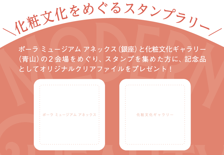 化粧文化ギャラリーとポーラ ミュージアム アネックス(東京都中央区銀座)の2会場をめぐり、スタンプを集めた方に、記念品としてオリジナルクリアファイルをプレゼント!