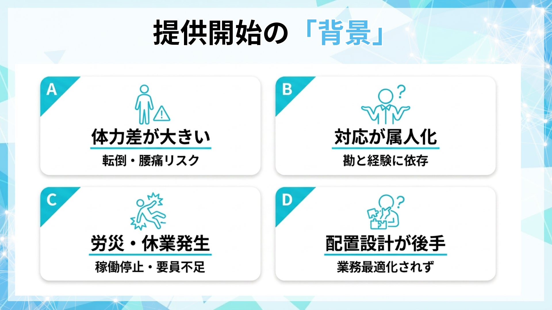 高齢就業と安全配慮は、労災・休業・生産性に直結し得るテーマである一方、現場では「勘と経験」で対応が属人化しやすく、配置や作業設計の最適化が後手になりがちです。
