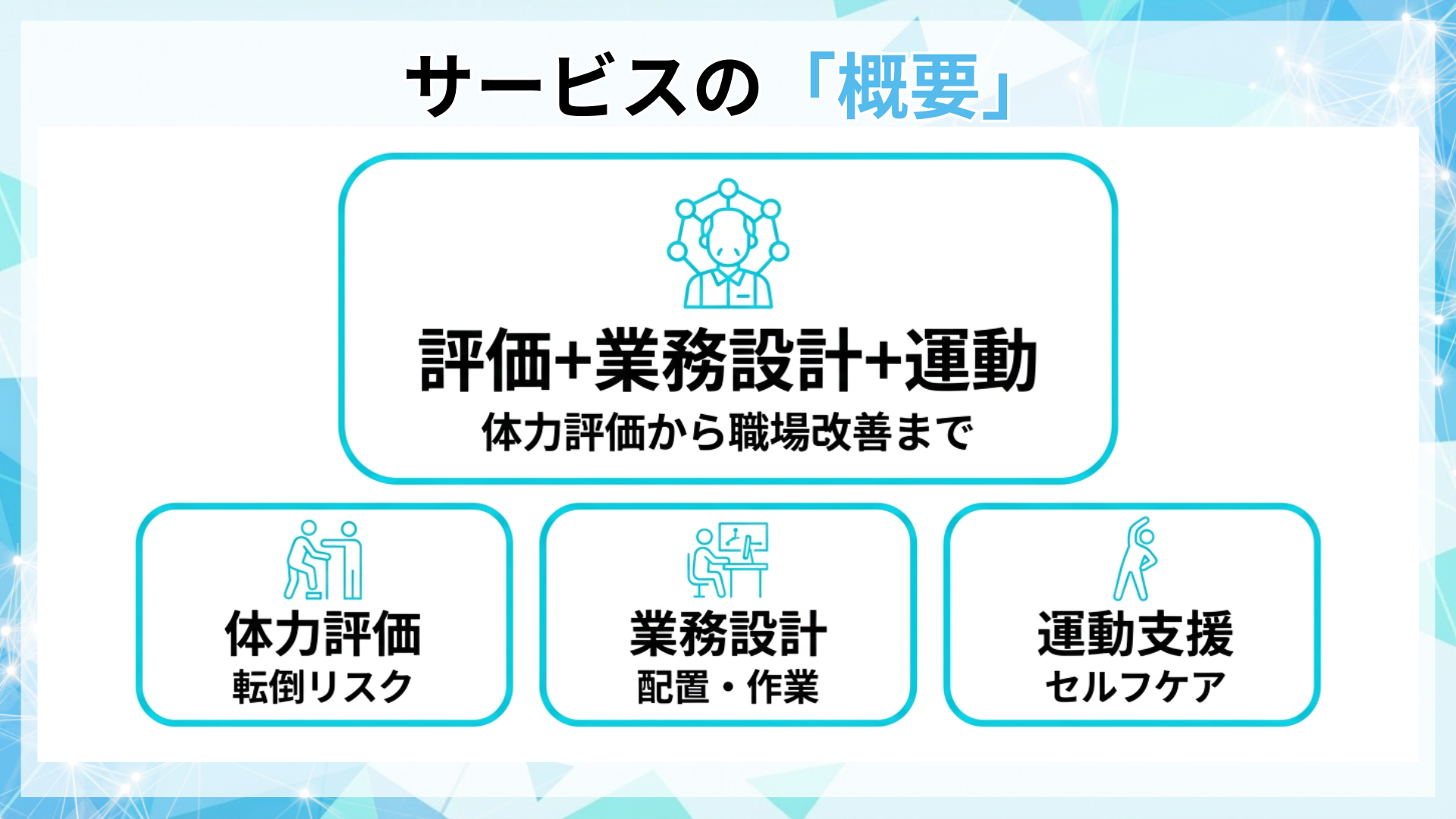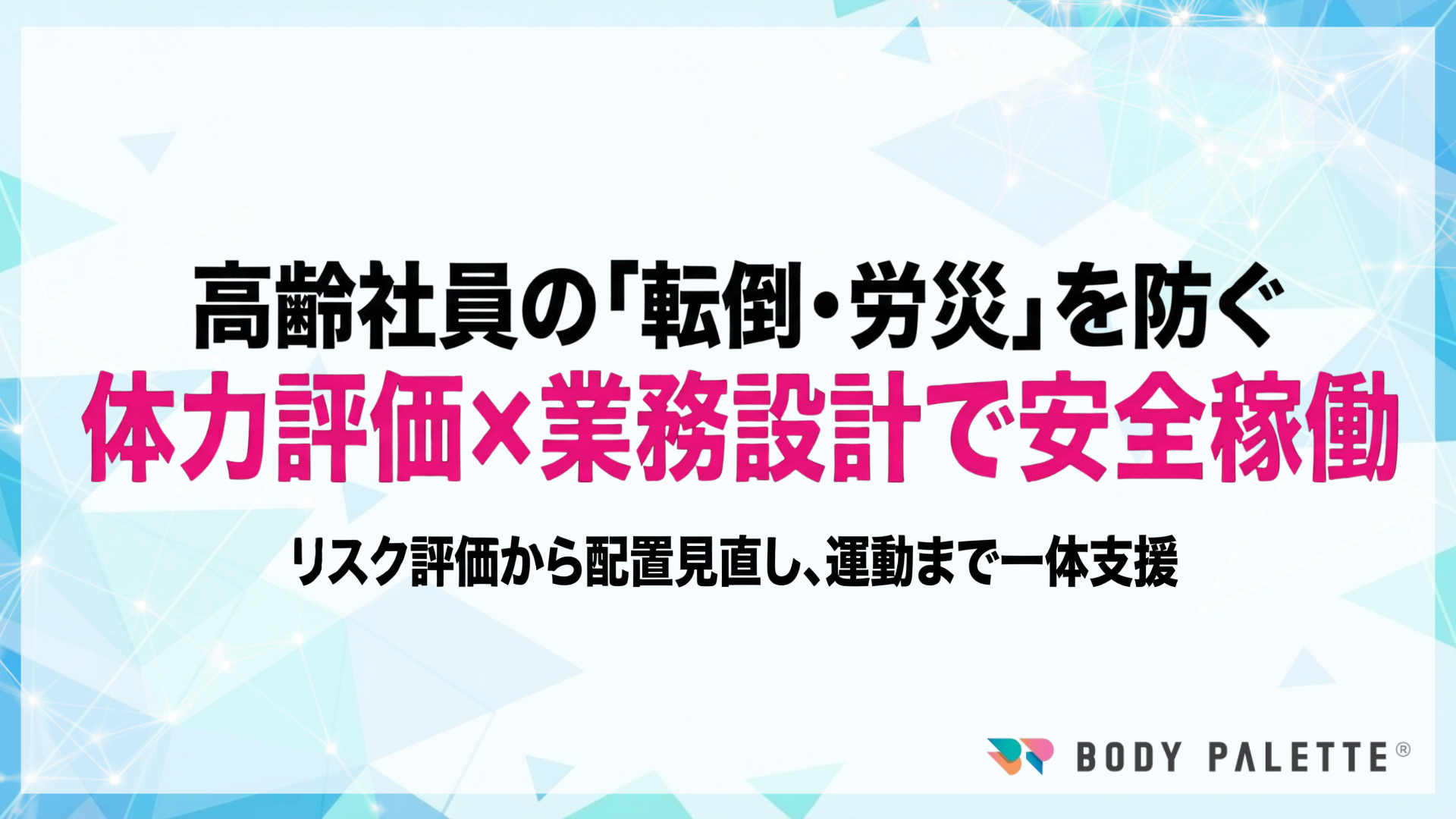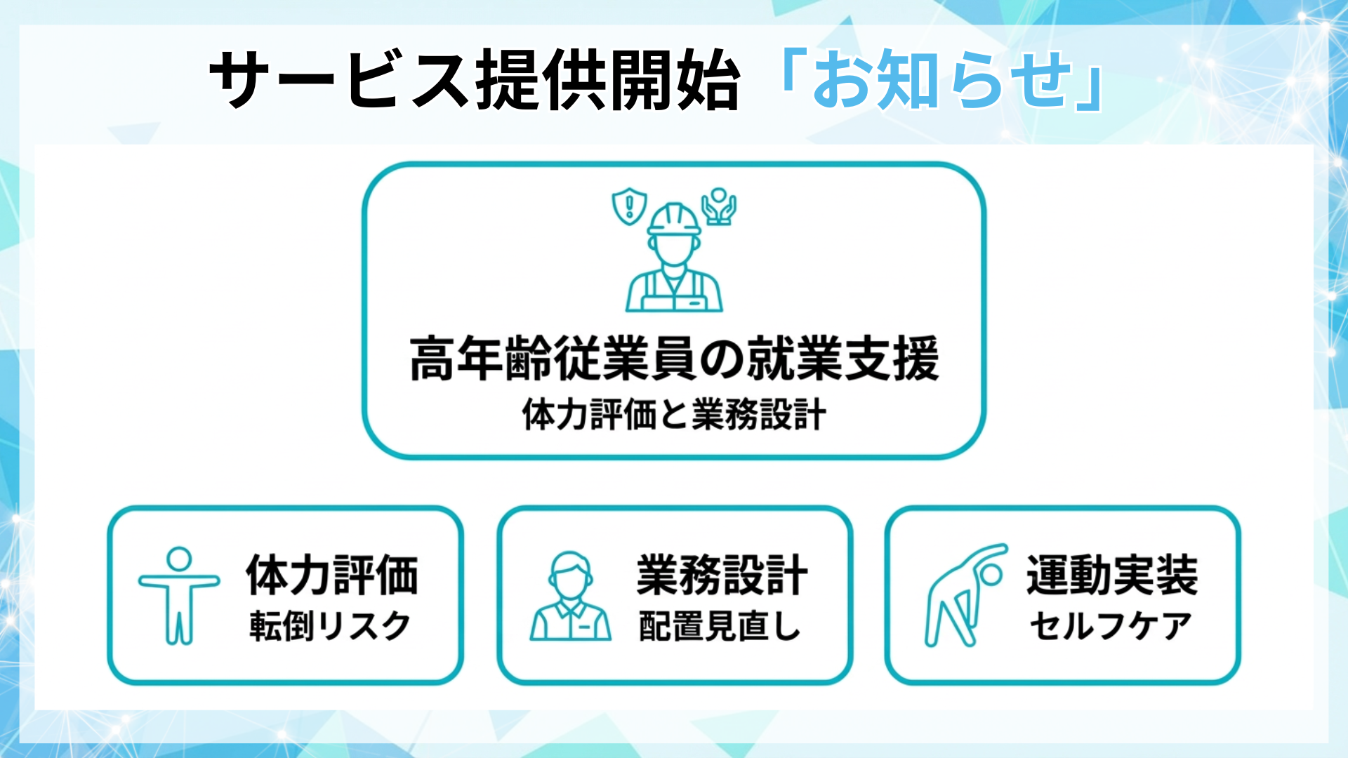 本支援は、高年齢従業員の体力・健康状況に応じて、体力/転倒リスク等の評価と配置・作業設計の改善を両面で行い、運動・セルフケアまで実装する就業支援プログラムです。