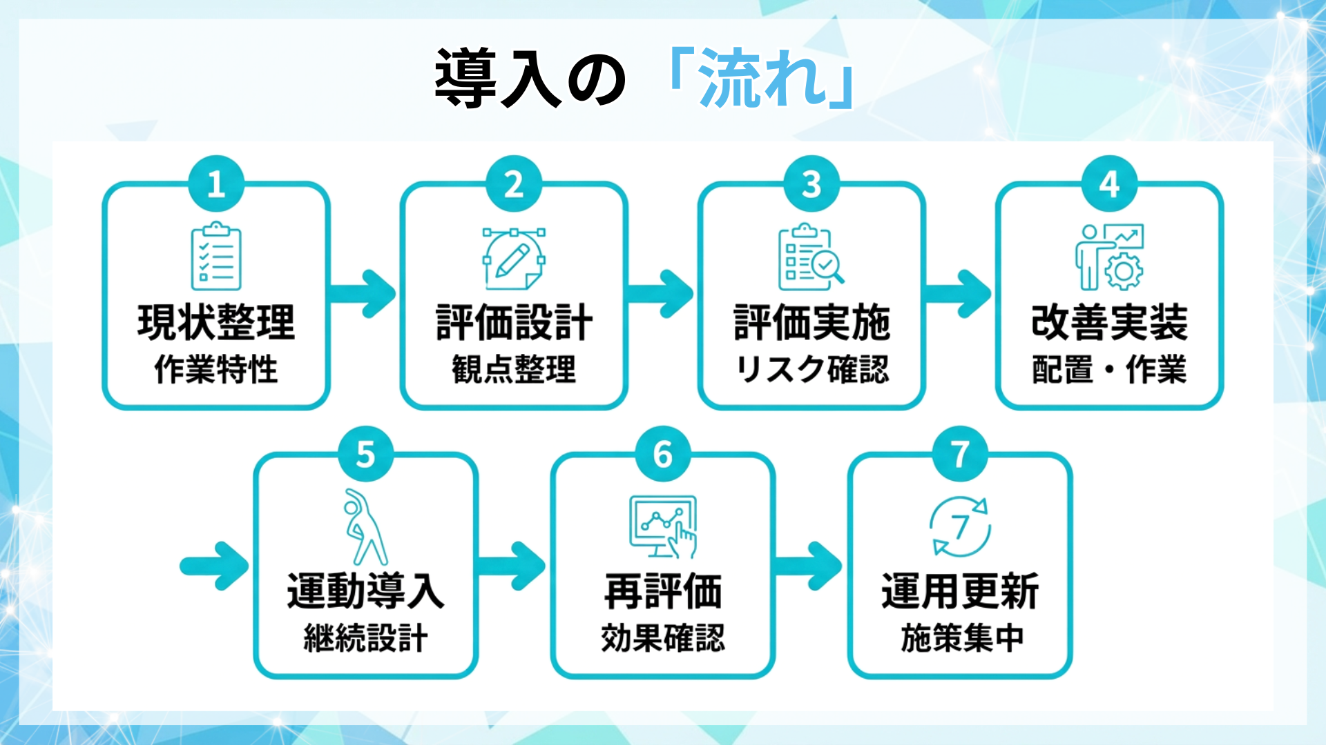 本支援は、体力・身体機能の評価と職場側の設計改善をセットで行い、現場で回る形に落とし込みます。