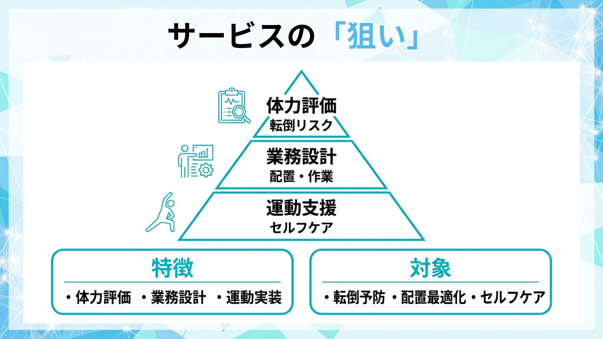 体力・転倒リスク等の評価と、配置・作業設計の見直し、運動・セルフケアを一体で支援し安全稼働を底上げ
