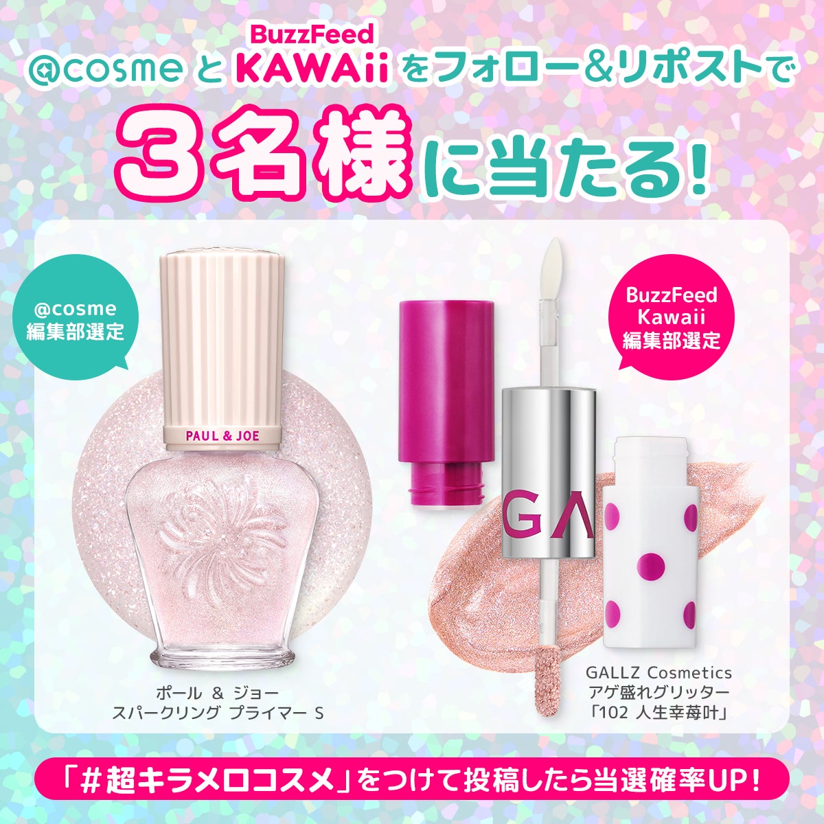 XのBuzzFeed Kawaii公式と@cosme公式アカウントにて「超キラメロコスメ」をテーマに、それぞれの特色を活かしたメイク提案を発信します。BuzzFeed Kawaiiからは「超キラメロメイク4選」をご提案。@cosmeからは「注目の超キラメロコスメ」をピックアップ。ユーザーの皆様に、最旬トレンドを自分らしく取り入れるためのヒントを、様々な角度からお届けします。