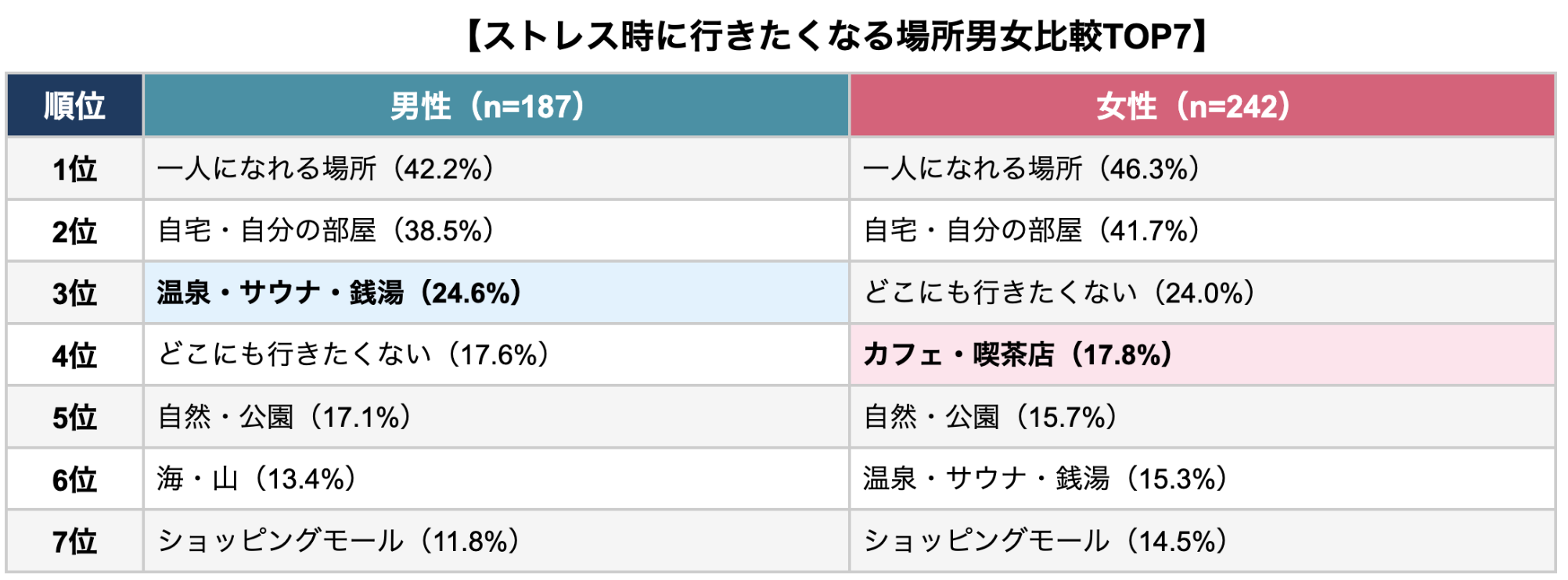 一方、女性は「カフェ・喫茶店」が4位(17.8%)に入り、男性(圏外)より高い傾向です。カフェで一人時間を過ごすことがストレス解消になっている女性が多いようです。