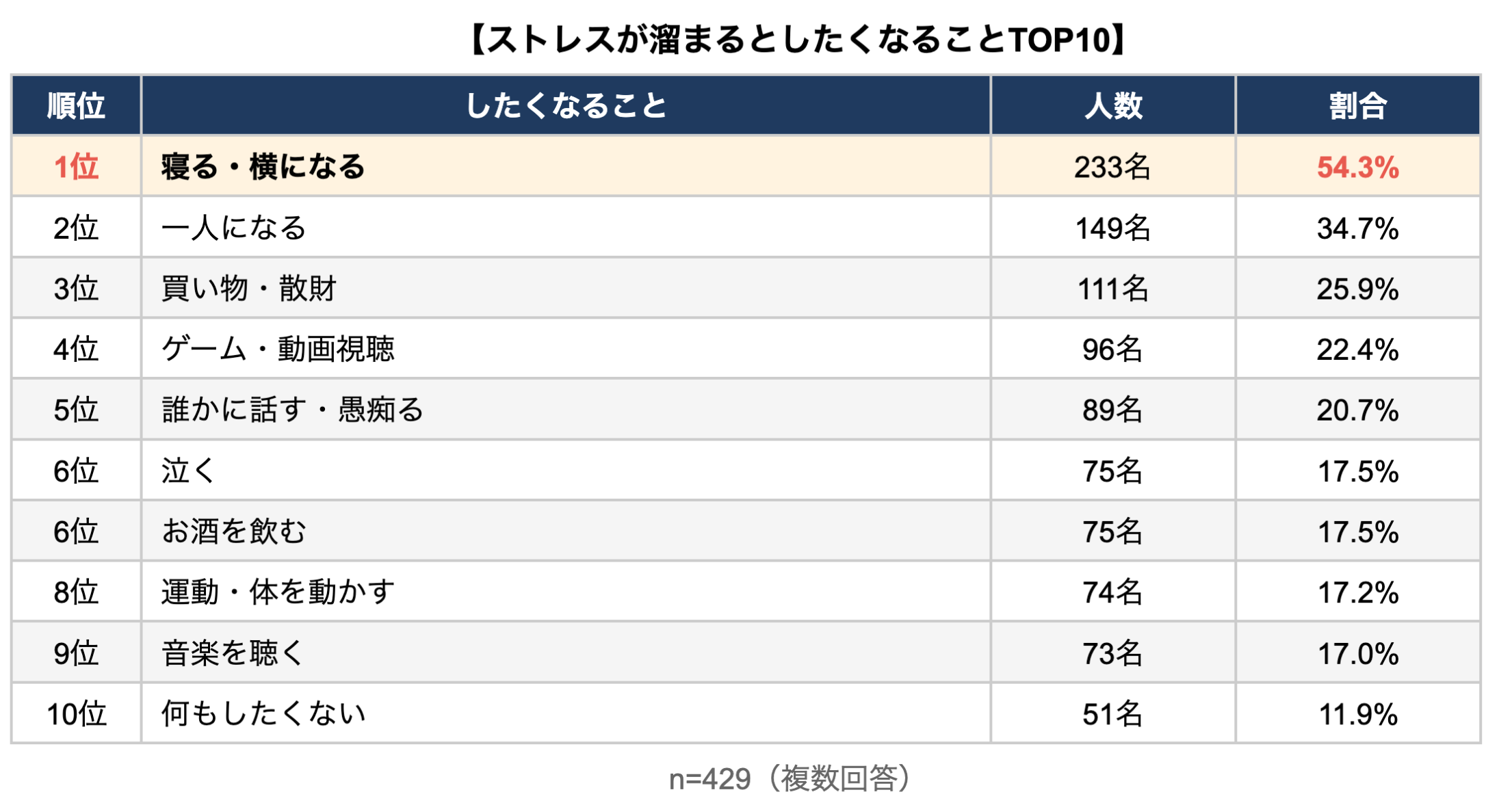 「ストレスが溜まるとしたくなること」を尋ねたところ、「寝る・横になる」が54.3%で圧倒的1位となりました。