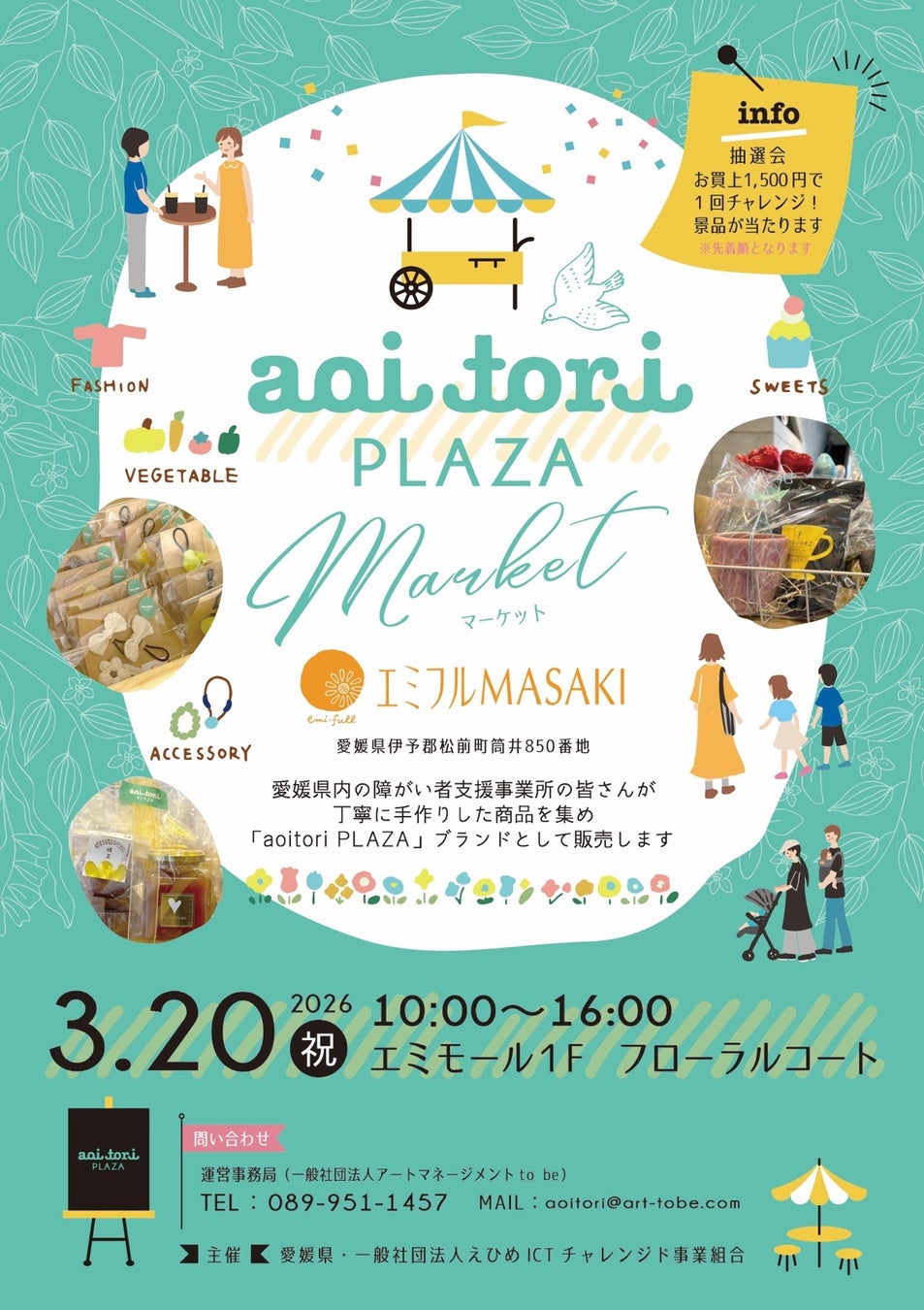 本イベントは、愛媛県内の障がい者支援事業所が製作した商品を集め、「aoitori PLAZA」ブランドとして販売するマーケットであり、食品やアクセサリー、雑貨など、手作りの魅力ある商品が多数並びます。