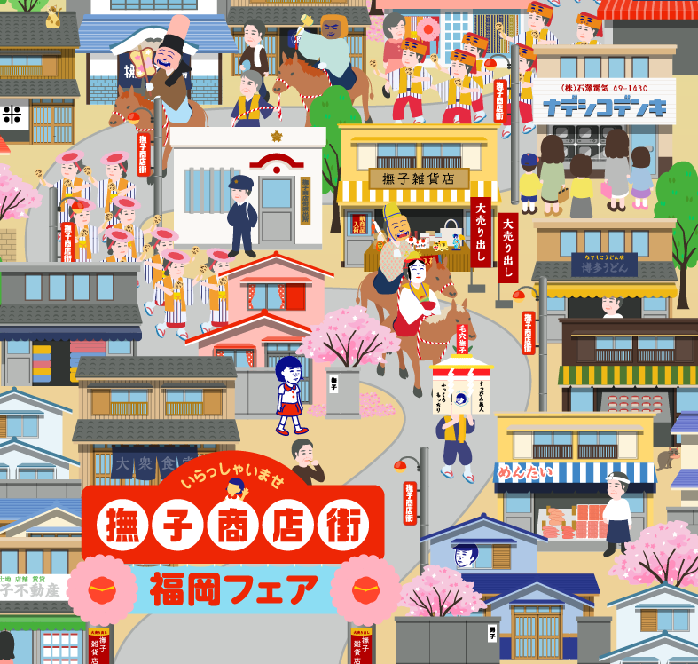 商店街は華やかな博多どんたくで賑わい、神社の露店には、明太子やあまおうなど福岡名物がずらり!あちこちよく見ると『ココも福岡!』というポイントがたくさん。巡っていると、気づけば福岡旅行気分に♪