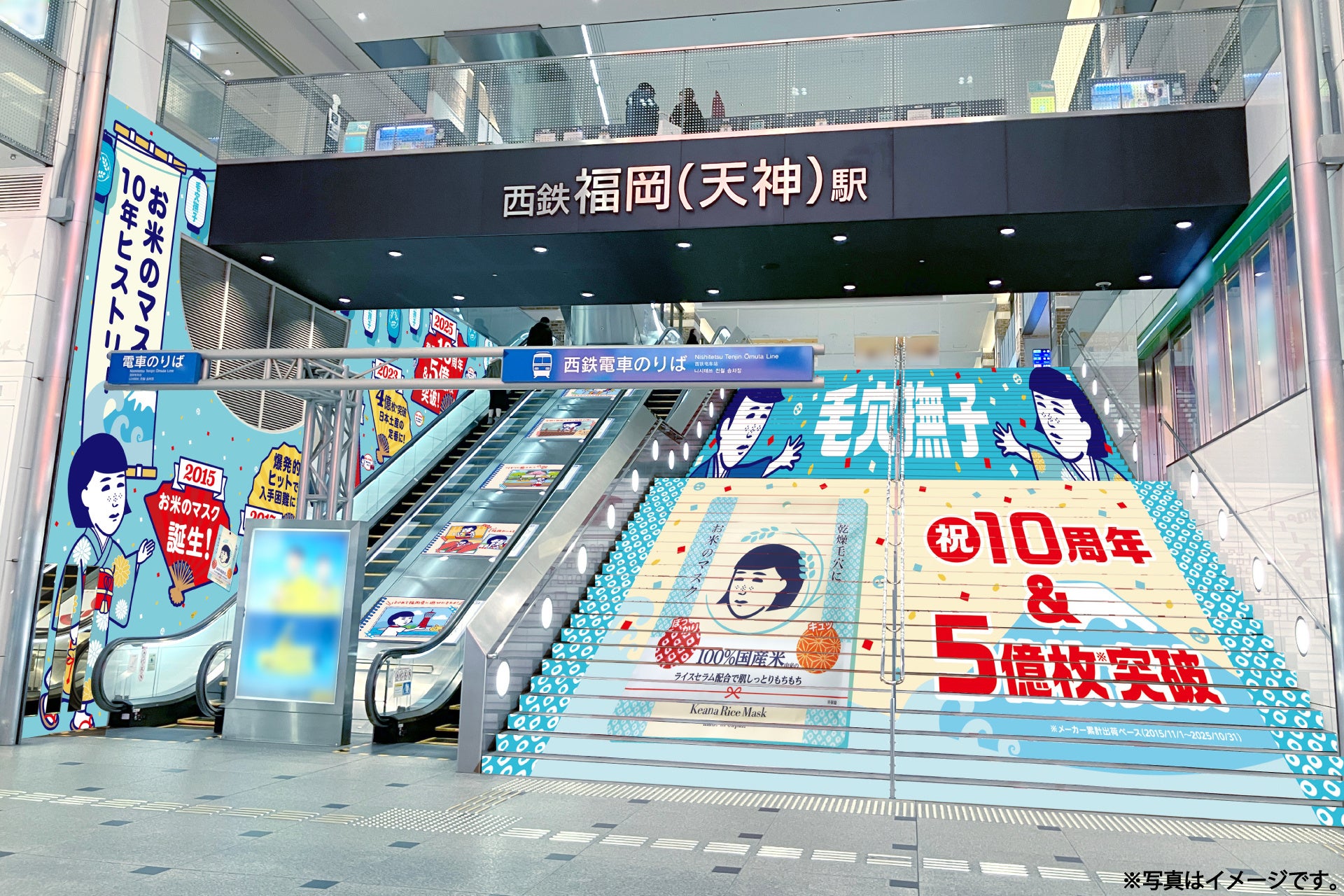 階段には、巨大な「お米のマスク」が登場!壁面には、お米のマスクの10周年ヒストリーも。エスカレーターのスロープでは、撫子ちゃんの楽しい福岡旅の様子も公開中♪