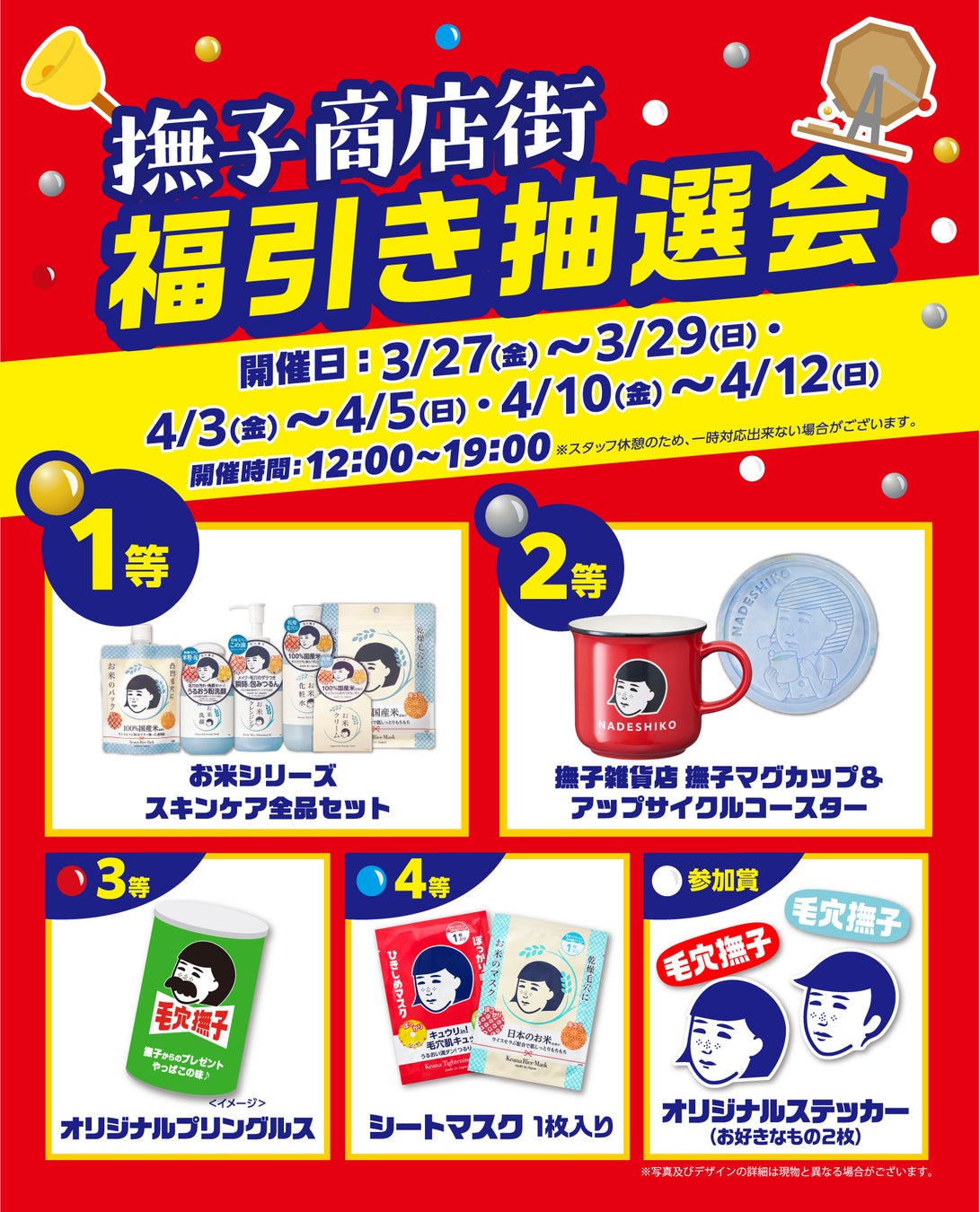 「お米シリーズ」全品セットや、オリジナルグッズが当たるチャンス!「毛穴撫子シリーズ」を1,000円(税込)以上ご購入または街頭配布の福引き券提示でご参加いただけます。みなさまのご参加をお待ちしております。