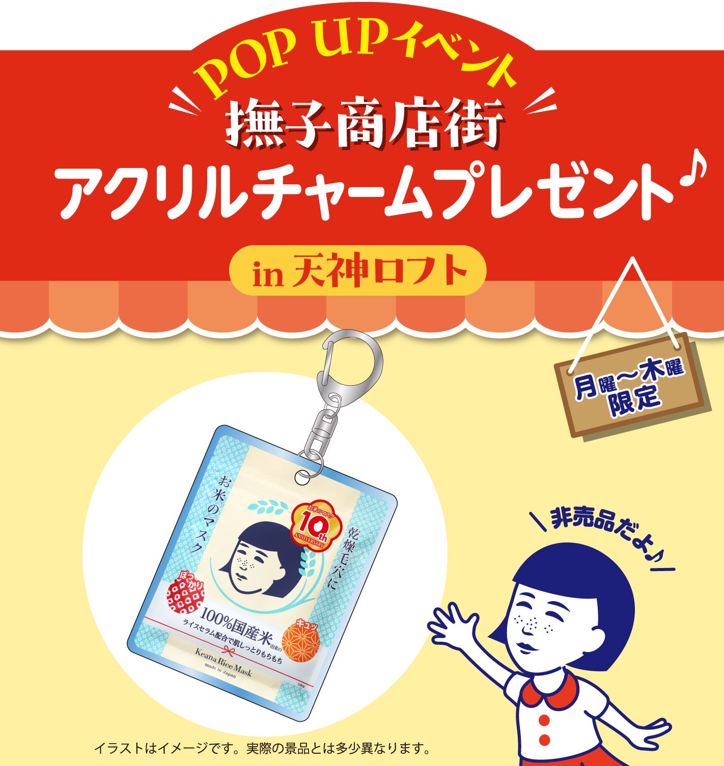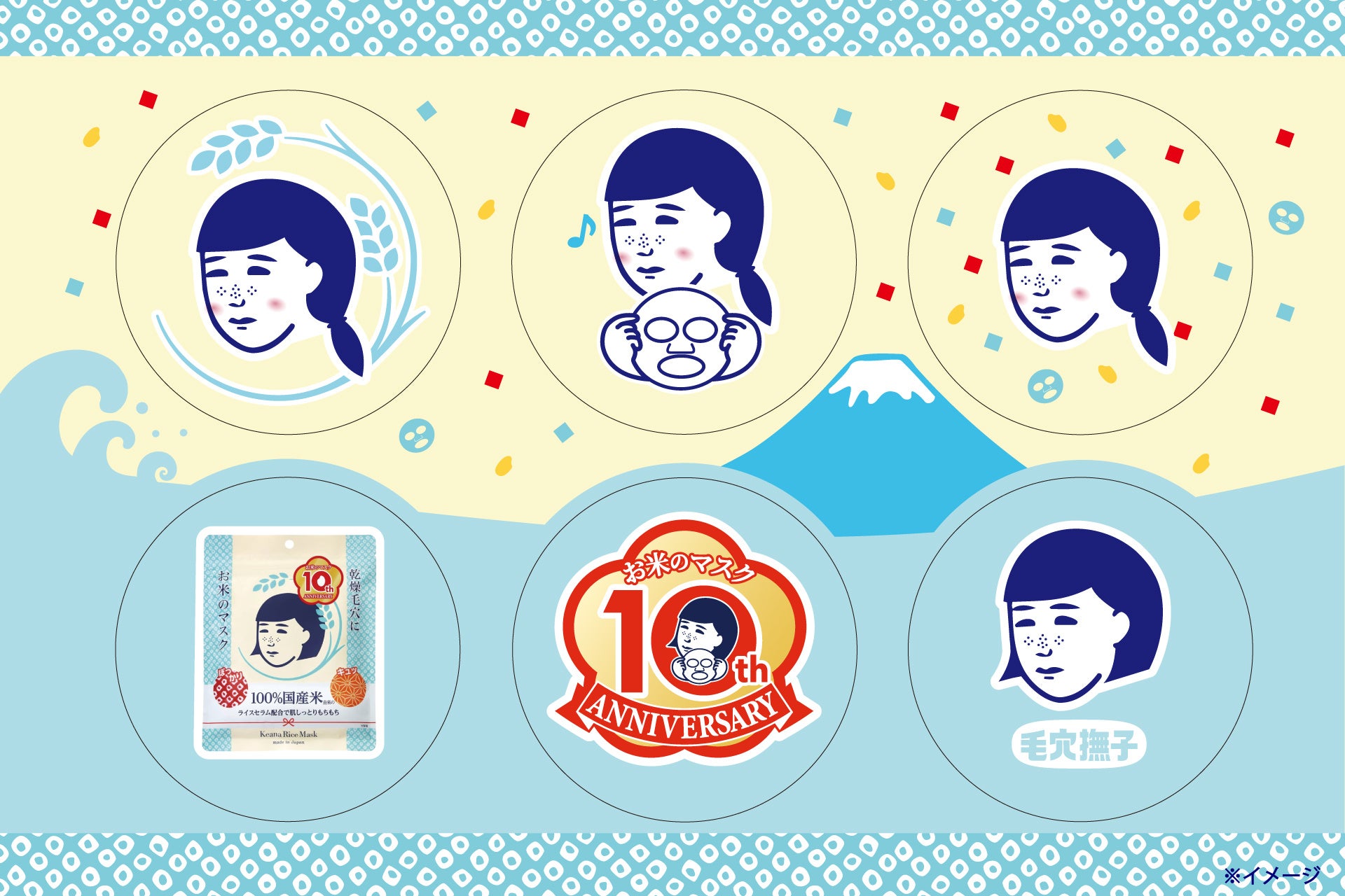 イベント期間中の月~木曜限定で、「毛穴撫子シリーズ」の商品を1,000円(税込)以上お買い上げいただいた方に、「お米のマスク」10周年ロゴ入りパッケージのオリジナルアクリルチャーム(非売品)をプレゼント。
