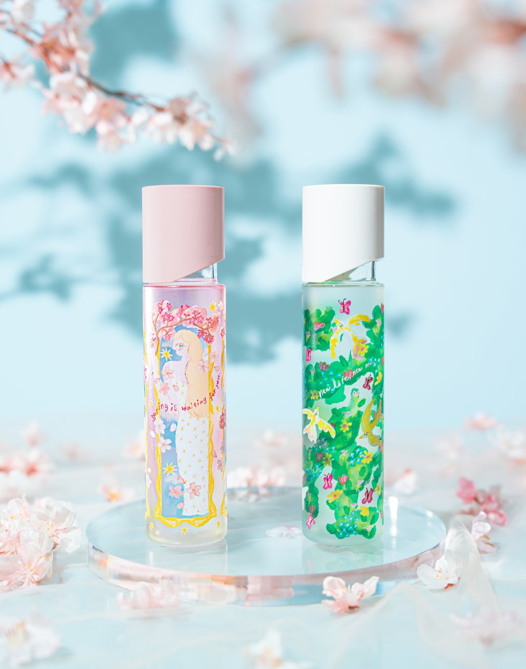 その上を自由に舞う鳥や蝶たちに自分を重ねて、気持ち新たにスキンケアを楽しんでもらえたら、と思いデザインしました。
