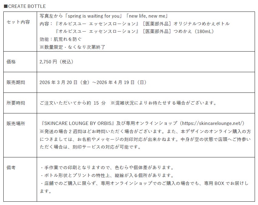 『SKINCARE LOUNGE BY ORBIS』限定サービスとしてご好評いただいている『CREATE BOTTLE』は、『オルビスユー エッセンスローション』のつめかえボトルに、お好みのキャップカラーとデザインが選択でき、お名前やメッセージの印字が可能です。3月20日(金)よりYUUKIさんとのコラボデザインとして、「spring is waiting for you」と「new life, new me」の2つのオリジナルつめかえボトルが登場いたします。