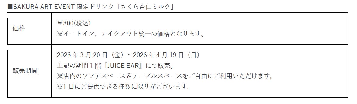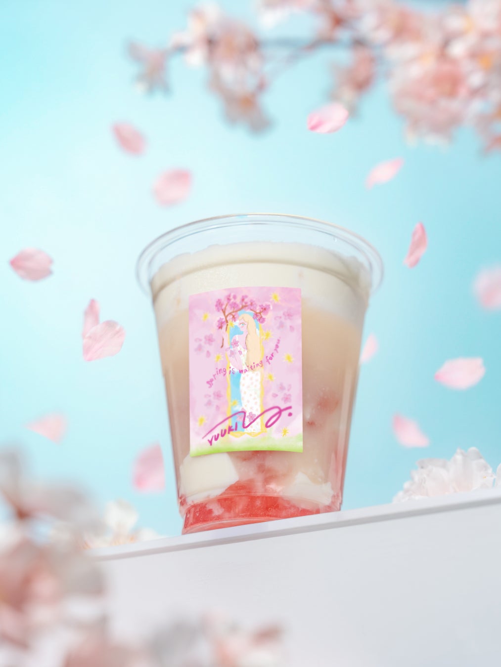 「SAKURA ART EVENT」第2弾のドリンクは、ライスミルク・ココナッツミルク・甘酒・桜ソースを合わせたほんのり桜色のミルクベースとなっております。中にはぷるっと食感が楽しい杏仁豆腐と桜ゼリーが入っており、混ぜると桜吹雪のように桜色が混ざり合う可愛らしいドリンクに仕上げました。