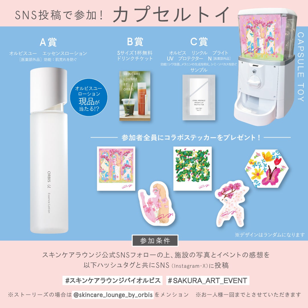オルビス株式会社(本社:東京都品川区、代表取締役社長:山口 裕絵)のブランド初となる体験特化型施設『SKINCARE LOUNGE BY ORBIS』は、2026年2月20日(金)から2026年4月19日(日)の期間、桜をテーマに2名のアーティストとコラボレーションを行うイベント「SAKURA ART EVENT」を開催しております。2026年2月20日(金)から2026年3月19日(木)の第一弾では、北海道出身のアーティスト田中マリナさんとのコラボレーションを実施し、多くの方にご来場いただき、好評をいただいているイベントとなっております。店内はたくさんの桜で彩られ、春の訪れを感じられる空間となっております。また、2026年3月20日(金)から2026年4月19日(日)の第二弾では、4人組バンド CHAI の元メンバーで作家・アーティストとして活動しているYUUKIさんとコラボレーションいたします。YUUKIさんが本イベントのために描いた作品が印刷されたオリジナルのオルビスユーボトルをはじめ、桜の期間限定ドリンクの販売をいたします。また、ご来場いただきイベントの様子をSNSで発信してくださった方限定で、オルビスの商品やYUUKIさんデザインのステッカーが当たるカプセルトイを実施いたします。