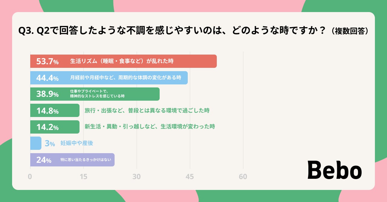 • 不調を感じるきっかけの第1位は「生活リズムの乱れ(53.7%)」であり 、春の新生活シーズンは特に注意が必要です。