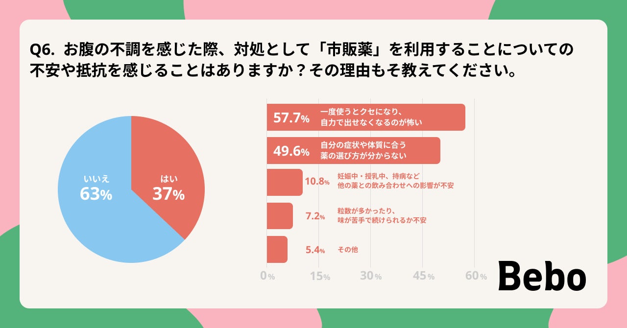 今回の調査では、女性の半数以上がお腹の不調を自覚しており 、その多くが環境変化や周期によって一時的に症状が引き起こされる傾向にあることが判明しました 。しかし、約4人に1人が「特に対処せず、様子を見る」と回答しており 、不快感を抱えながらもケアが後回しにされている実態が浮き彫りとなっています。また、市販薬の利用に関しては、約6割が抱く「薬が一度使うとクセになり、自力で出せなくなるのが怖い」という依存への恐怖や 、約半数が感じる「自分の症状や体質に合う薬の選び方が分からない」といった心理的ハードルが存在します。