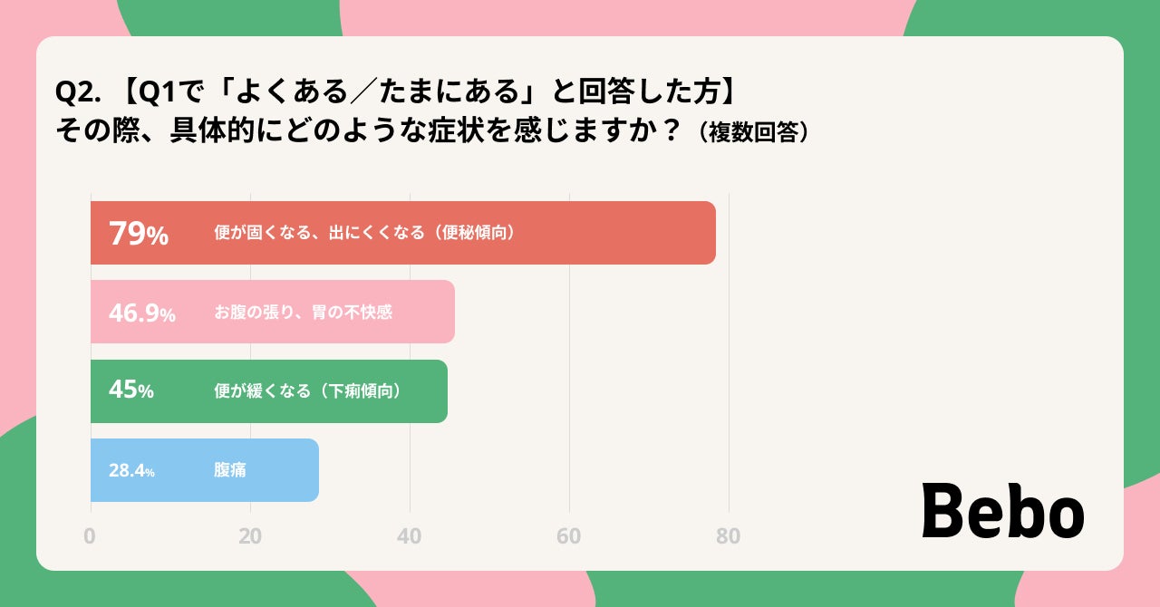 • その症状は「便の出にくさ(79%)」 だけでなく、「張り・不快感(46.9%)」 、「便のゆるみ(45%)」や「腹痛(28.4%)」 など身体的な苦痛を伴っています。