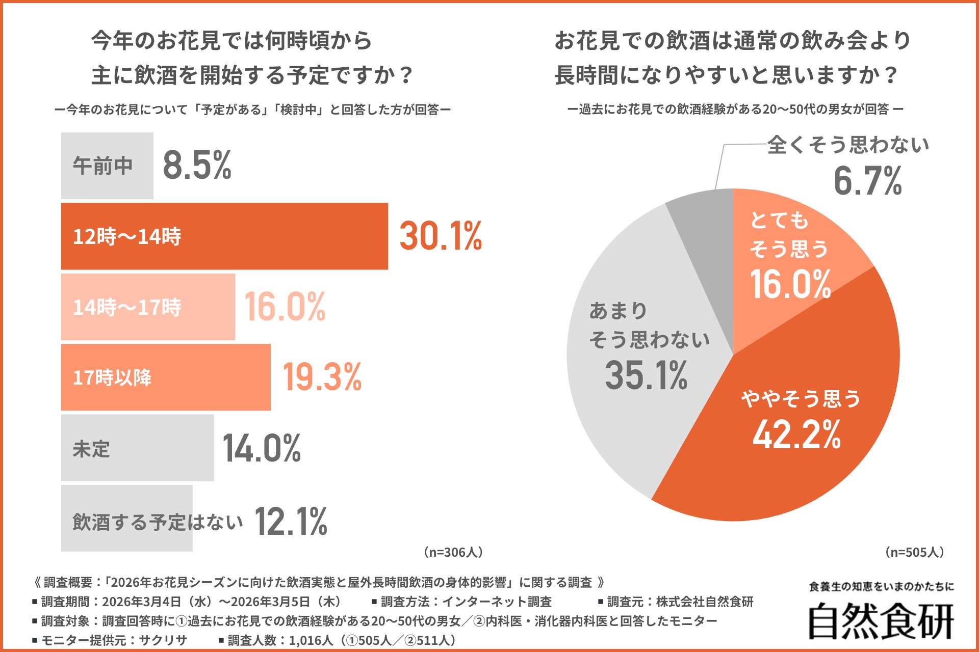 株式会社自然食研(所在地:大分県豊後高田市、代表者:佐々木 興平)は、①過去にお花見での飲酒経験がある20~50代の男女/②内科医・消化器内科医を対象に、「2026年お花見シーズンに向けた飲酒実態と屋外長時間飲酒の身体的影響」に関する調査を行いました。