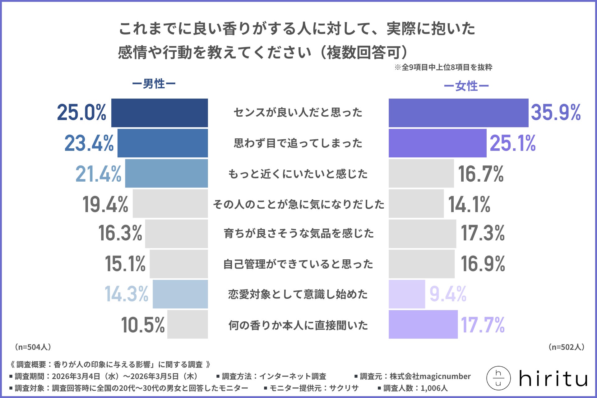 株式会社magicnumber(本社:東京都港区)は、全国の20代〜30代の男女を対象に、「香りが人の印象に与える影響」に関する調査を行いました。