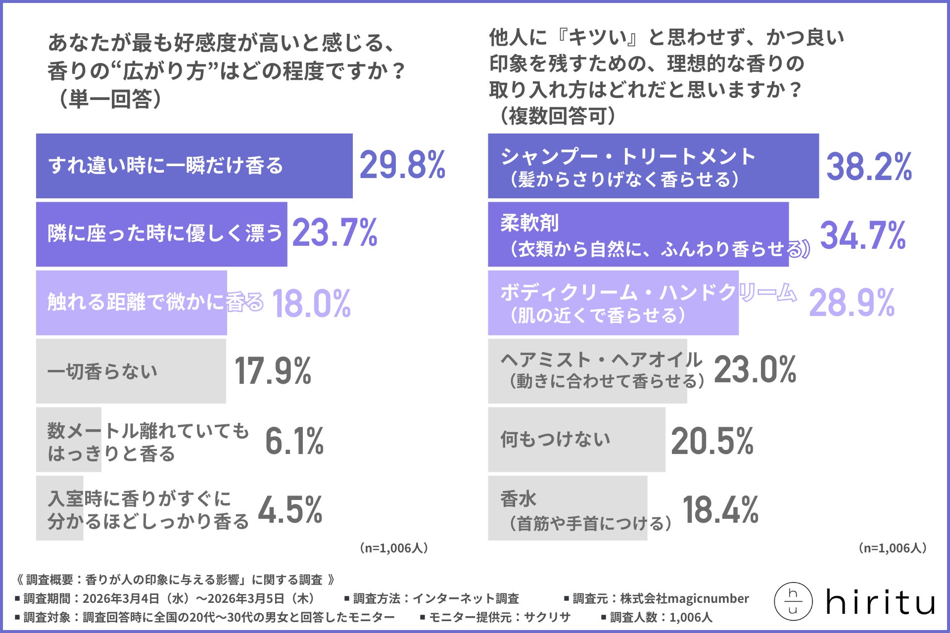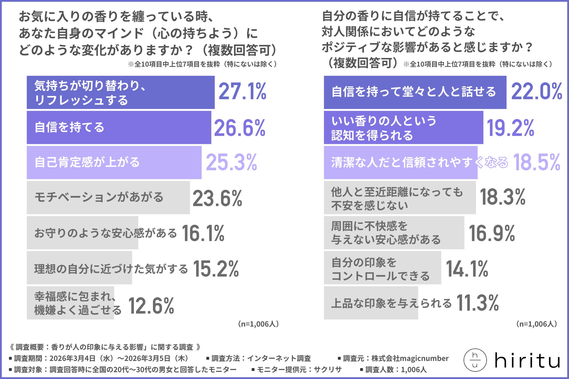 そこで今回、株式会社magicnumber(https://magicnumber.co.jp/)は、全国の20代〜30代の男女を対象に、「香りが人の印象に与える影響」に関する調査を行いました。
