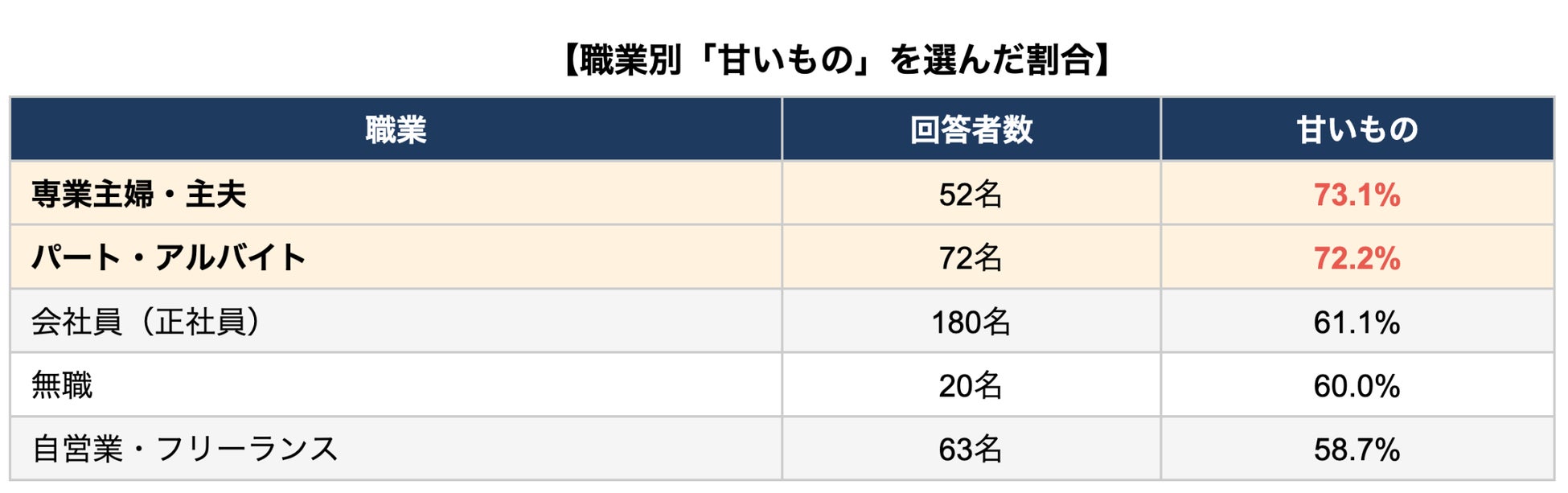 専業主婦・主夫(73.1%)とパート・アルバイト(72.2%)は、会社員(61.1%)よりも10ポイント以上高い結果となりました。家事や育児のストレスを甘いもので癒そうとする傾向がうかがえます。