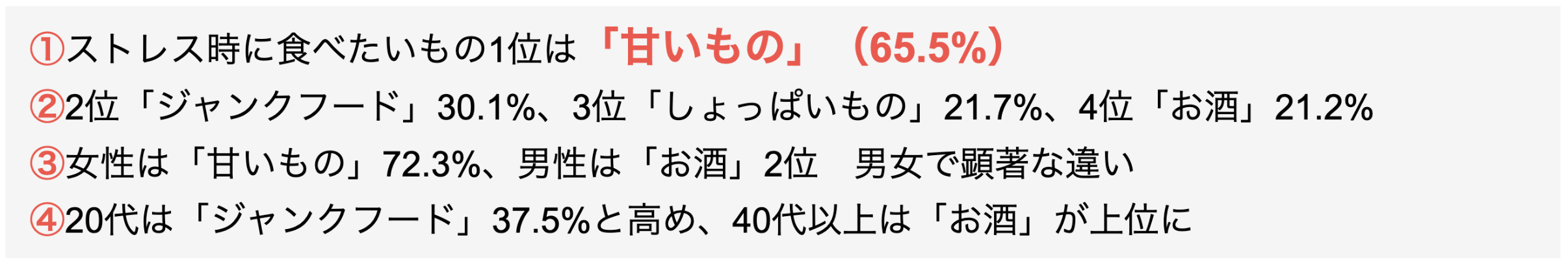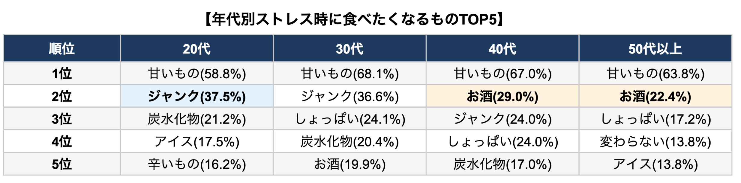 特筆すべきは20代で「ジャンクフード」が2位(37.5%)と高いことです。ファストフードやコンビニ飯が身近な若年層は、ストレス時にも手軽に食べられるジャンクフードに手が伸びる傾向があります。