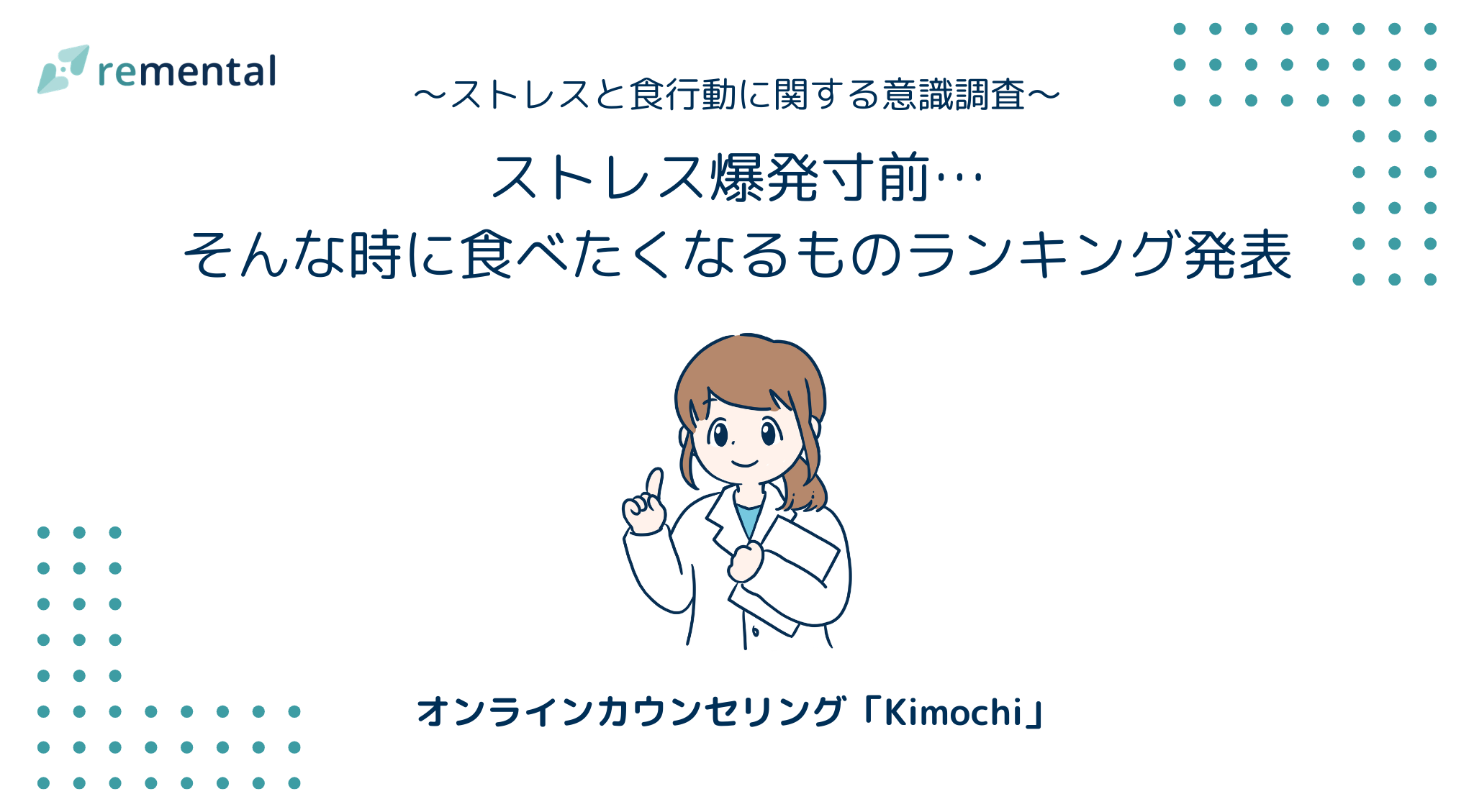 オンラインカウンセリングサービス「Kimochi」を運営する株式会社remental(本社:東京都渋谷区、代表取締役:佐藤利音)は、20代〜50代以上の男女429名を対象に「ストレスと食行動に関する意識調査」を実施しました。