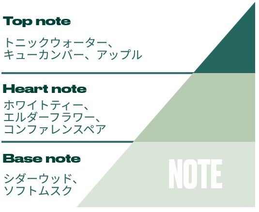 爽やかなトニックウォーター、キューカンバーとアップルのフレッシュな甘さが繊細に絡み、ホワイトティーとエルダーフラワーの優美なブレンドが広がる。朝露に輝く花々のようなフレッシュフローラルの香りは、ジューシーなコンファレンスペア(洋ナシ)でまとまり、穏やかなシダーウッドと柔らかなムスクの余韻へと落ち着きます。