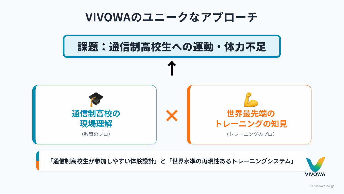 VIVOWAの特徴は、「通信制高校の現場理解」と、「世界最先端のトレーニング知見」を