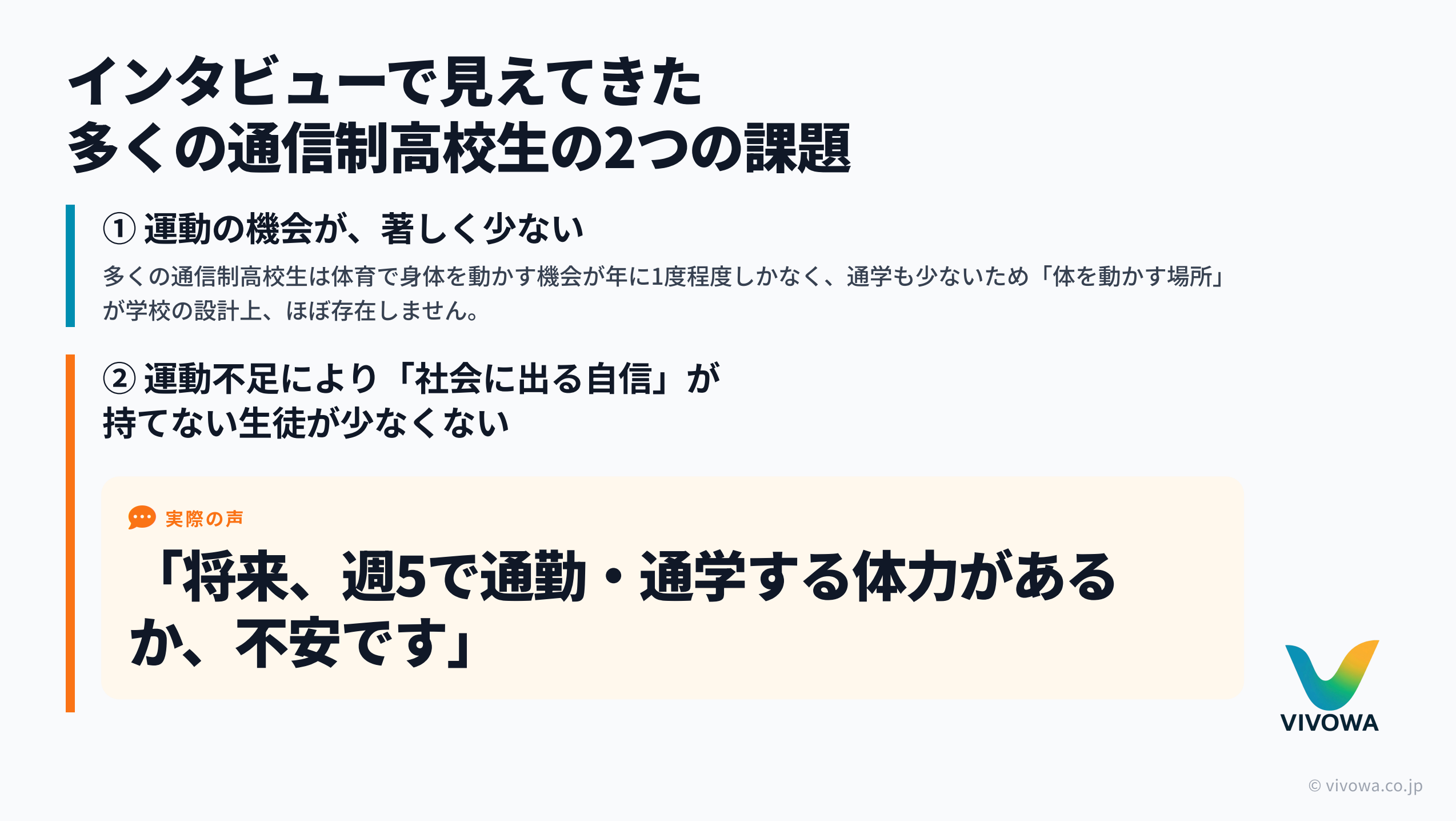 通信制高校生向けの運動支援はこれまで、学校教育でも、既存のフィットネス産業でも、十分に最適化されてきた領域ではありませんでした。VIVOWAはこの未開拓領域に対し、教育とフィットネスの両面からアプローチすることで、新しい選択肢を提示していきます。