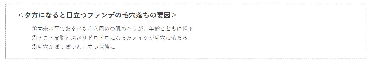 ※11 メタクリル酸メチルクロスポリマー、酸化亜鉛、ジメチコン=皮脂と結合することで固い膜を形成してファンデーションの毛穴落ちを防ぐ