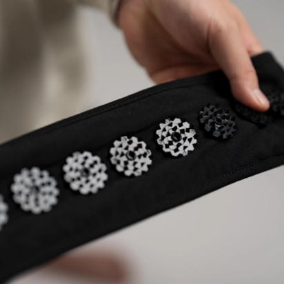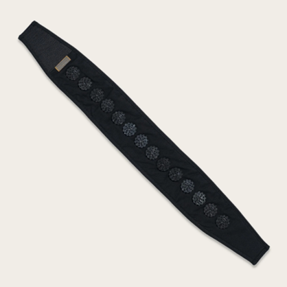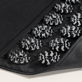 また、一枚仕立てのエラスティック素材(伸縮性のある生地)を採用しているため、すべてのスパイクに均一に圧がかかりやすく、巻く強さに応じて心地よいフィット感に調整していただけます。