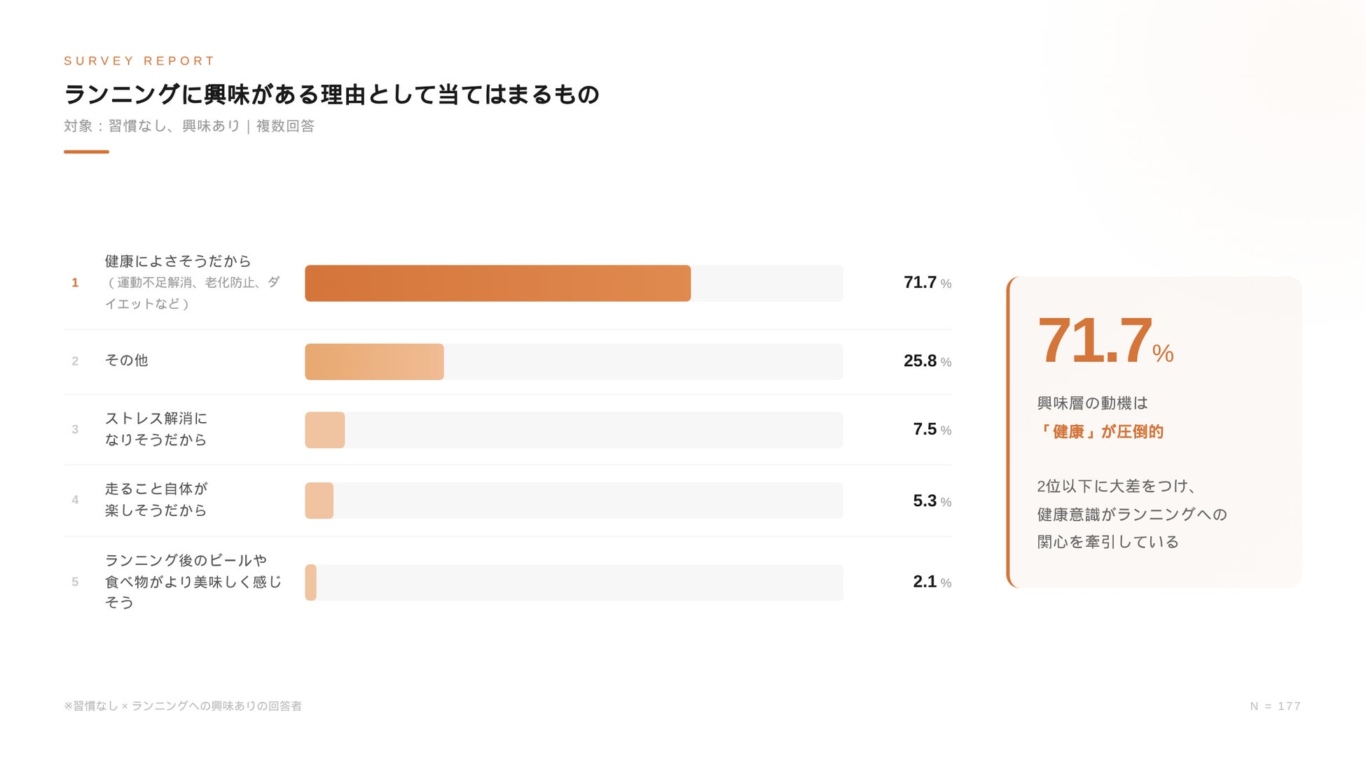 また、ランニングに興味がある理由として「健康に良さそうだから」という回答が約72%を占めており、喫煙者には健康や自己管理に対して前向きな関心を持つ層が一定数存在しています。こうした結果から、都心にある喫煙所は健康をテーマとした情報や行動変容を促すコミュニケーションを受け入れやすい空間特性を有していると考えられます。(※2)
