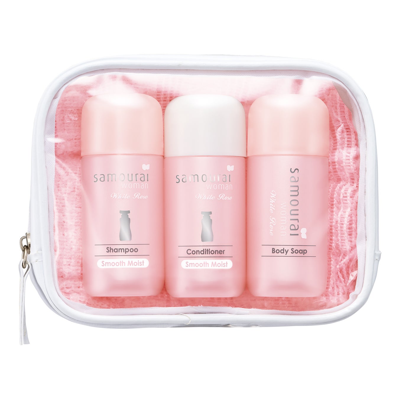 シャンプー・コンディショナー・ボディソープに泡立てボディタオルがセットになったトラベルセット。「サムライウーマン ホワイトローズの香り」で、指通りがするん、とする、しなやかスムースモイストタイプのシャンプー・コンディショナーです。ホワイトローズの甘さが広がる、ホワイトフローラル フルーティーな香りです。