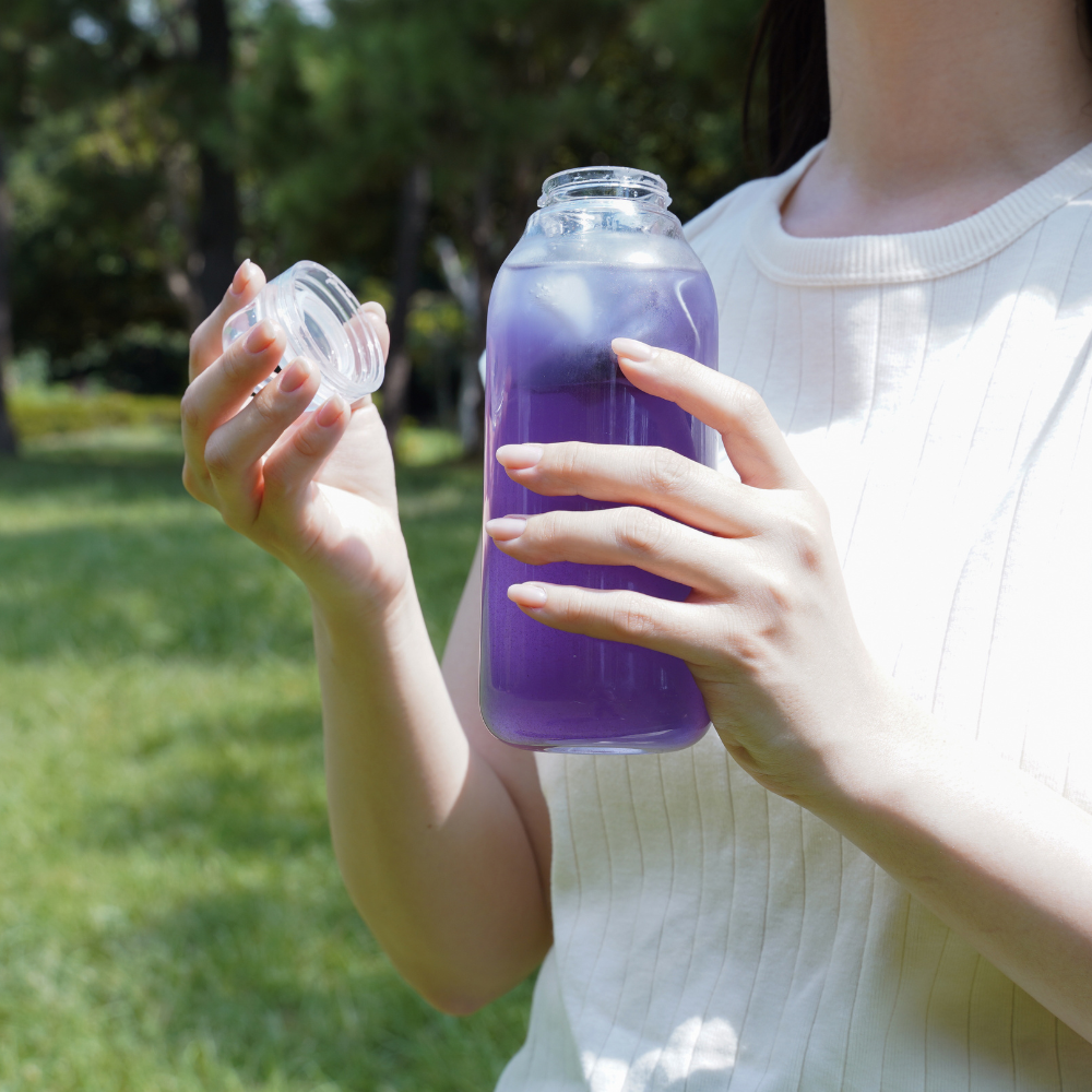 きれいな青色のバタフライピーとリコリスに、ふわりとももが香る華やかな味わい。レモンを絞ると、青から紫に、さらに鮮やかなピンクへと色が変わります。