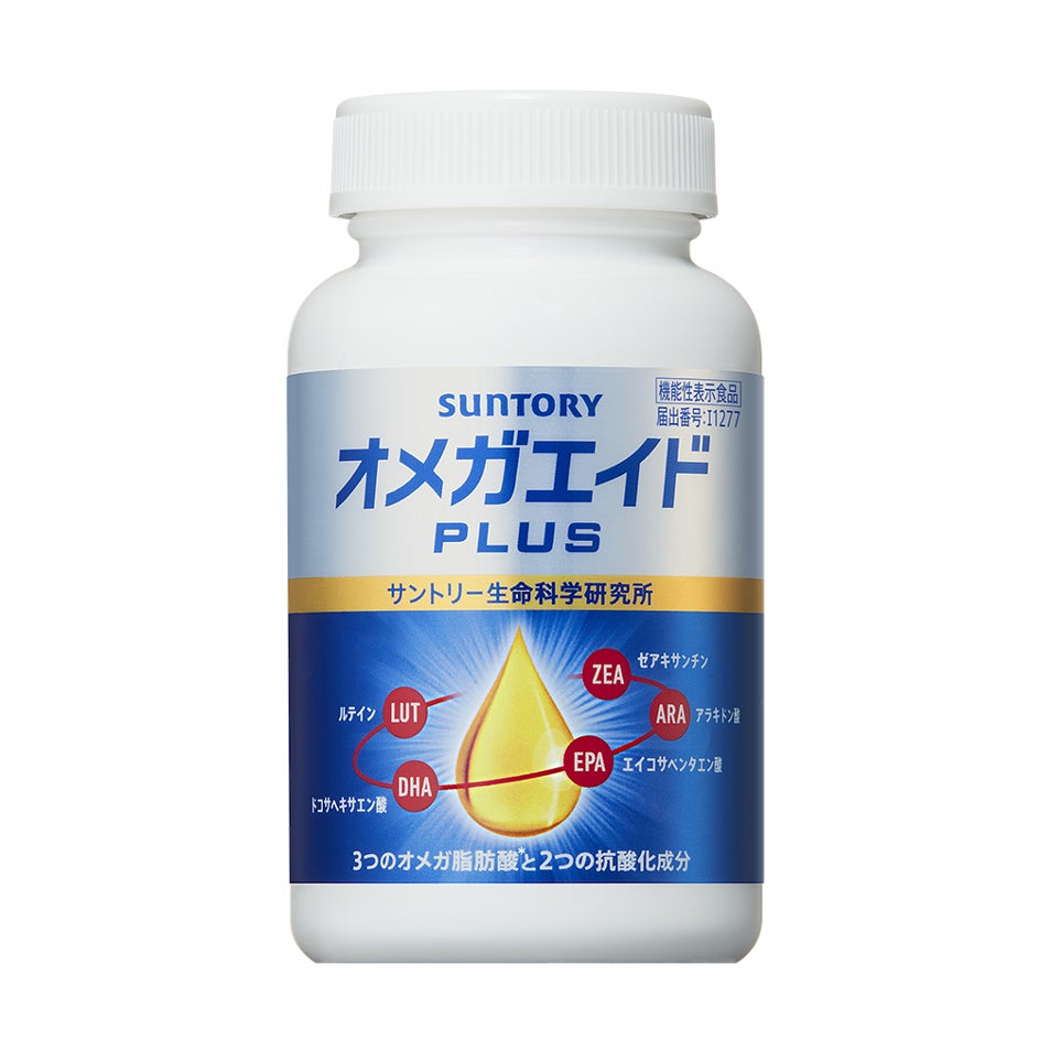 サントリーの長年の脳研究から生まれた「オメガエイドPLUS」は、頭の働きに大切なアブラであるDHA(ドコサヘキサエン酸)・EPA(エイコサペンタエン酸)・ARA(アラキドン酸)と抗酸化成分であるルテイン・ゼアキサンチンを配合したサプリメントです。この5つの成分により、記憶力(覚え思い出す力)を維持することが報告されています。また、DHA・EPA・ARAにより注意力・前向きな気分の維持※3をサポートします。2011年の発売以来、累計出荷本数は2,000万本※4を突破し、多くのお客様にご愛用いただいている、認知機能サポート領域市場売上No.1のサプリメントです。