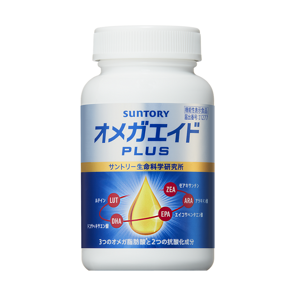 サントリーの長年の脳研究から生まれた「オメガエイドPLUS」は、頭の働きに大切なアブラであるDHA(ドコサヘキサエン酸)・EPA(エイコサペンタエン酸)・ARA(アラキドン酸)と抗酸化成分であるルテイン・ゼアキサンチンを配合したサプリメントです。この5つの成分により、記憶力(覚え思い出す力)を維持することが報告されています。また、DHA・EPA・ARAにより注意力・前向きな気分の維持※3をサポートします。2011年の発売以来、累計出荷本数は2,000万本※4を突破し、多くのお客様にご愛用いただいている、認知機能サポート領域市場売上No.1のサプリメントです。