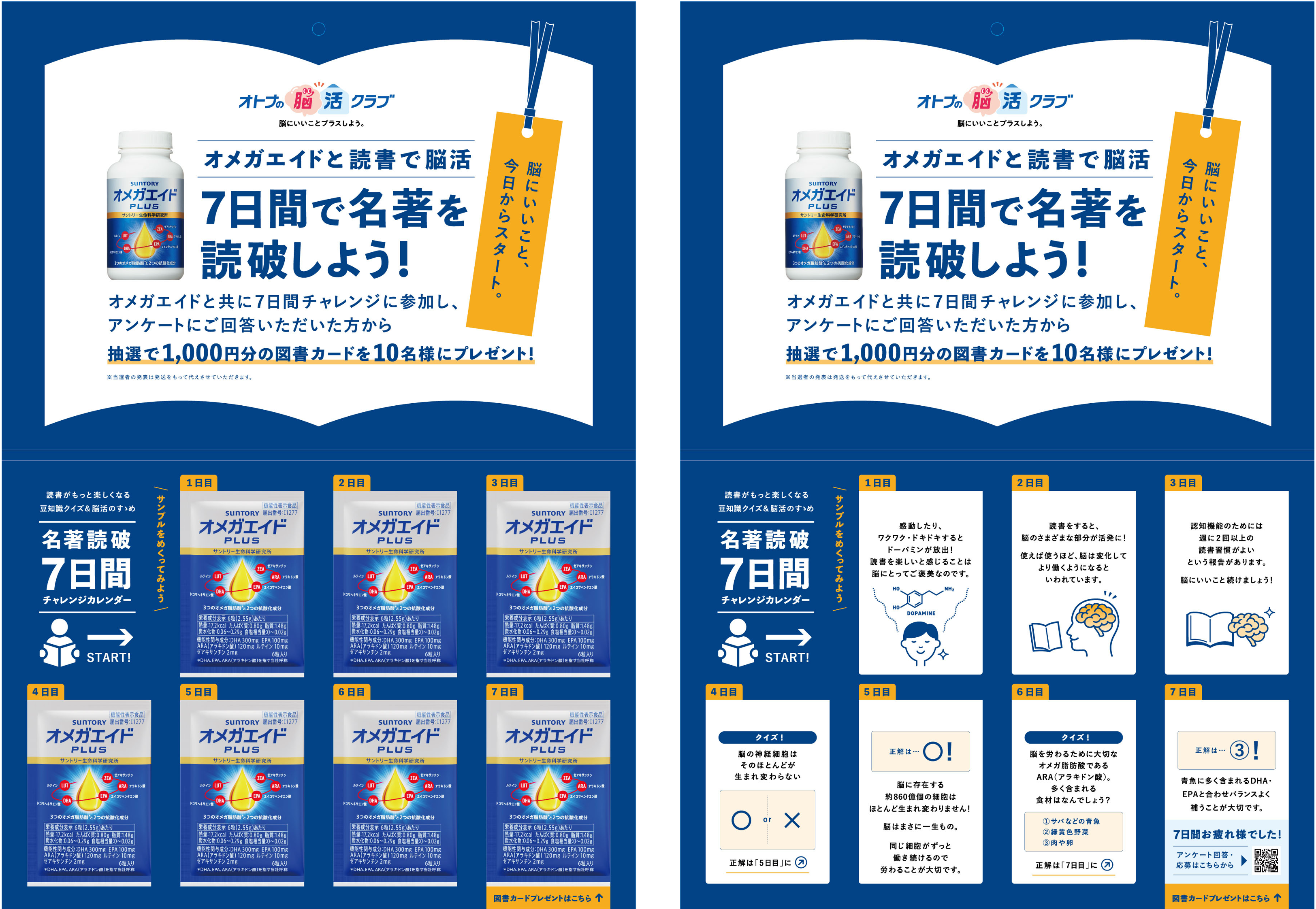 「名著読破チャレンジ」では、三省堂書店が厳選する名著を購入された“オトナ世代”の方に、脳にいい栄養を配合したサプリメント「オメガエイドPLUS」7日分とカレンダーがセットになった、チャレンジキットをお渡しします。名著の購入者は、チャレンジキットをもとに読書とサプリメントの飲用を7日間続けることで、“脳にいいこと”を楽しみながら体験することができます。