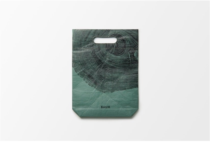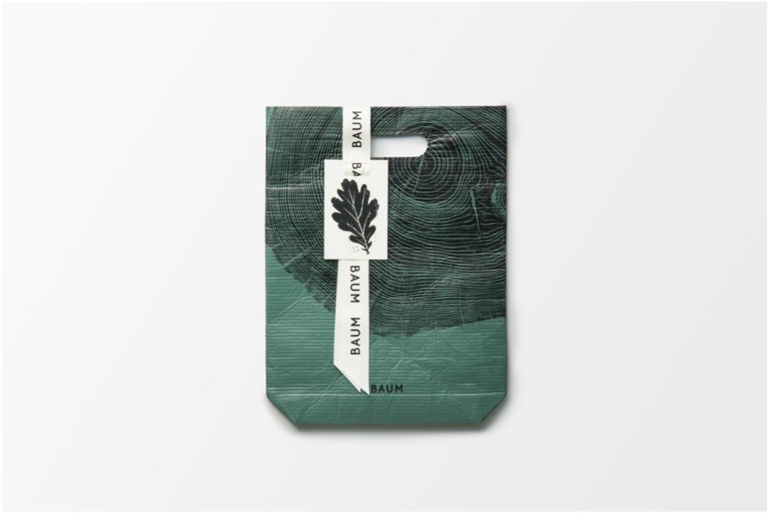 BAUMを象徴する年輪と、おだやかな森を思わせる深いグリーンの色合いが、贈り手の想いとともに樹木の彩りを添えるギフトバッグ。撥水加工を施したリサイクルPET素材使用。やわらかな風合いで大切な贈り物をやさしく包んだ後も、繰り返しお使いいただけます。