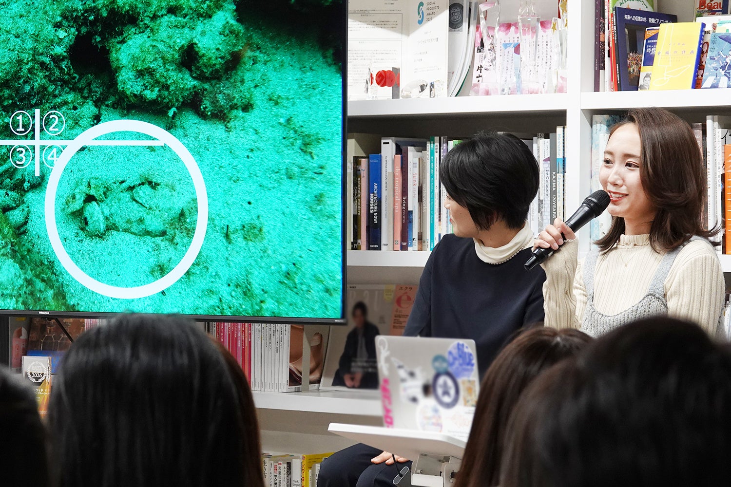 東真七水さん(Dr.blue代表、ダイビングインストラクター)は水中のゴミを拾うダイバーとして注目されている方で、現在はダイビングショップを経営しながら、海洋環境に関する講演や、拾ったゴミによるアップサイクルなど、幅広く活動されています。スライドでは水中の写真からなんのゴミがどこにあるのかというクイズで、楽しみながら実際の水中ゴミの現状を伝えてくれました。これまでに累計おおよそ2トンものゴミを拾い上げたそうですが、単なるゴミ拾いという行為ではなく、ゴミを拾ったことで生まれる「心が整う」気持ちの部分と継続することが大切だと語りました。