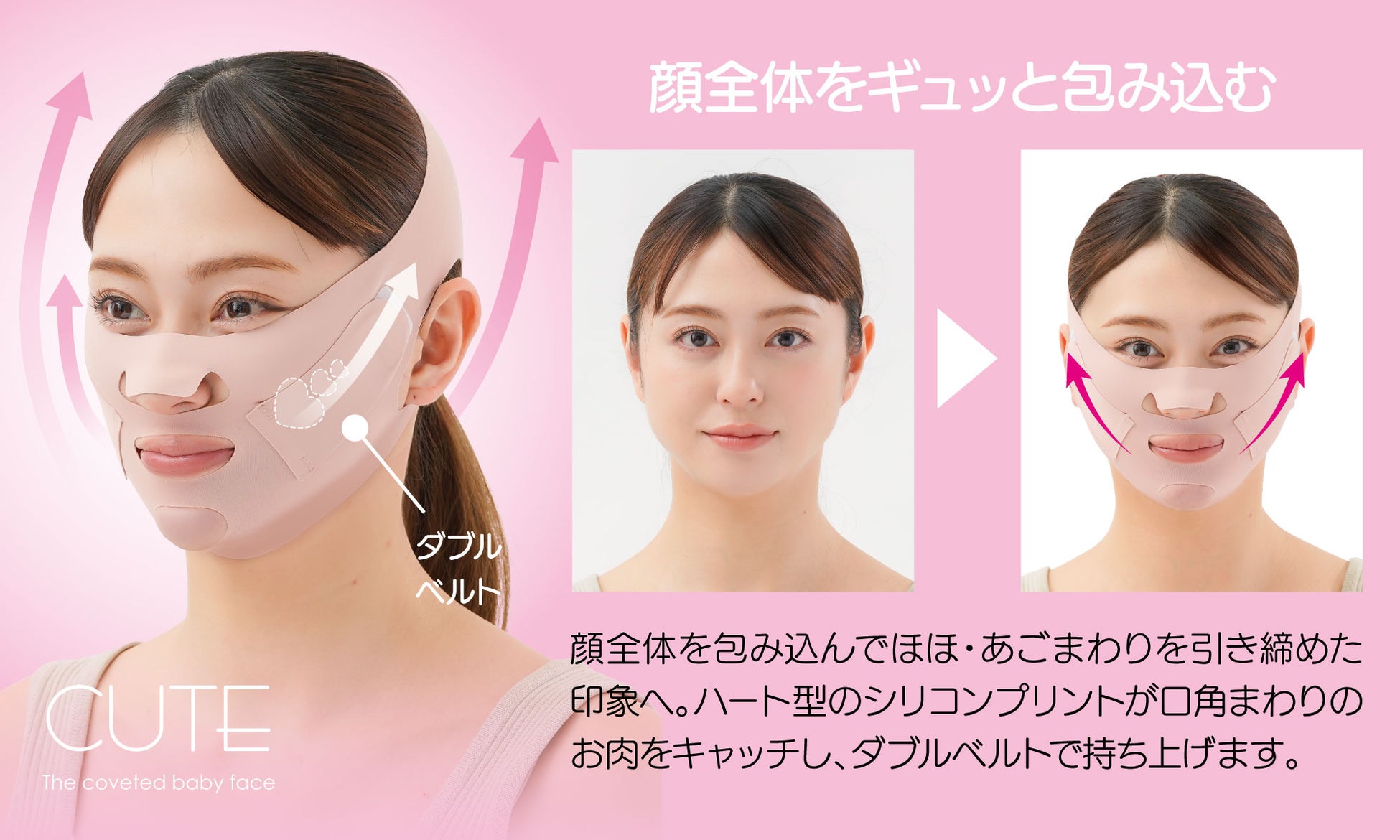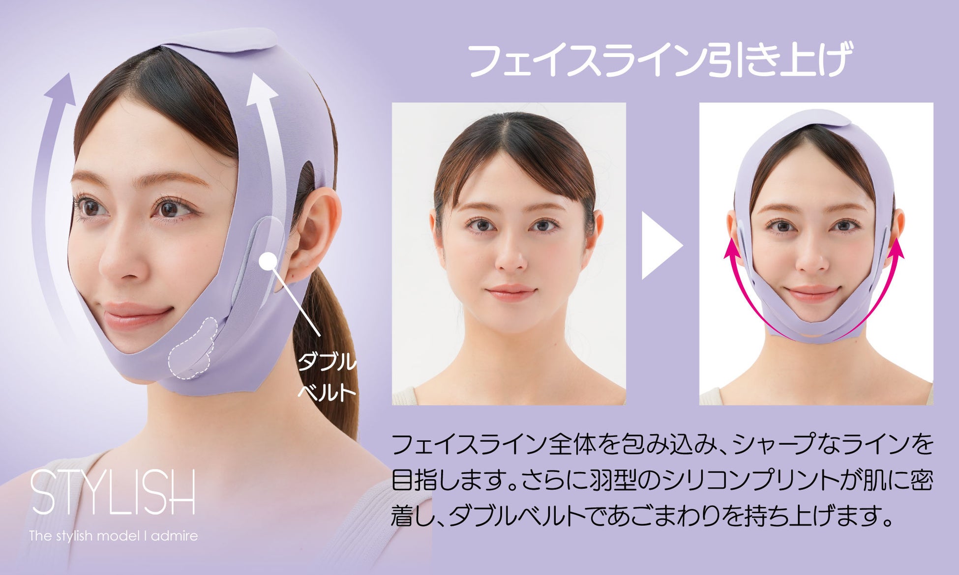 ダブルベルトが顔全体をまるごと包んで引き上げ、全体的にリフトアップすることで小顔を目指します。