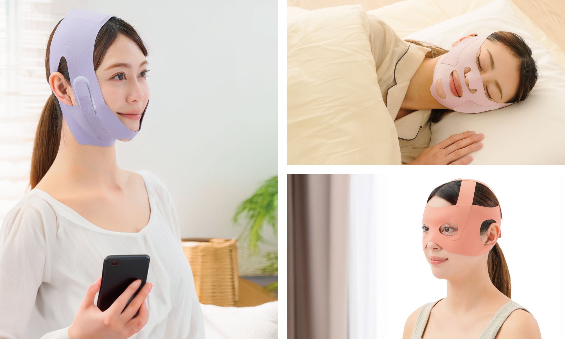 立体構造のリボン型シリコンプリントとダブルベルトでほほや目元をしっかり包み込み、すっきりとした印象のフェイスラインへ。