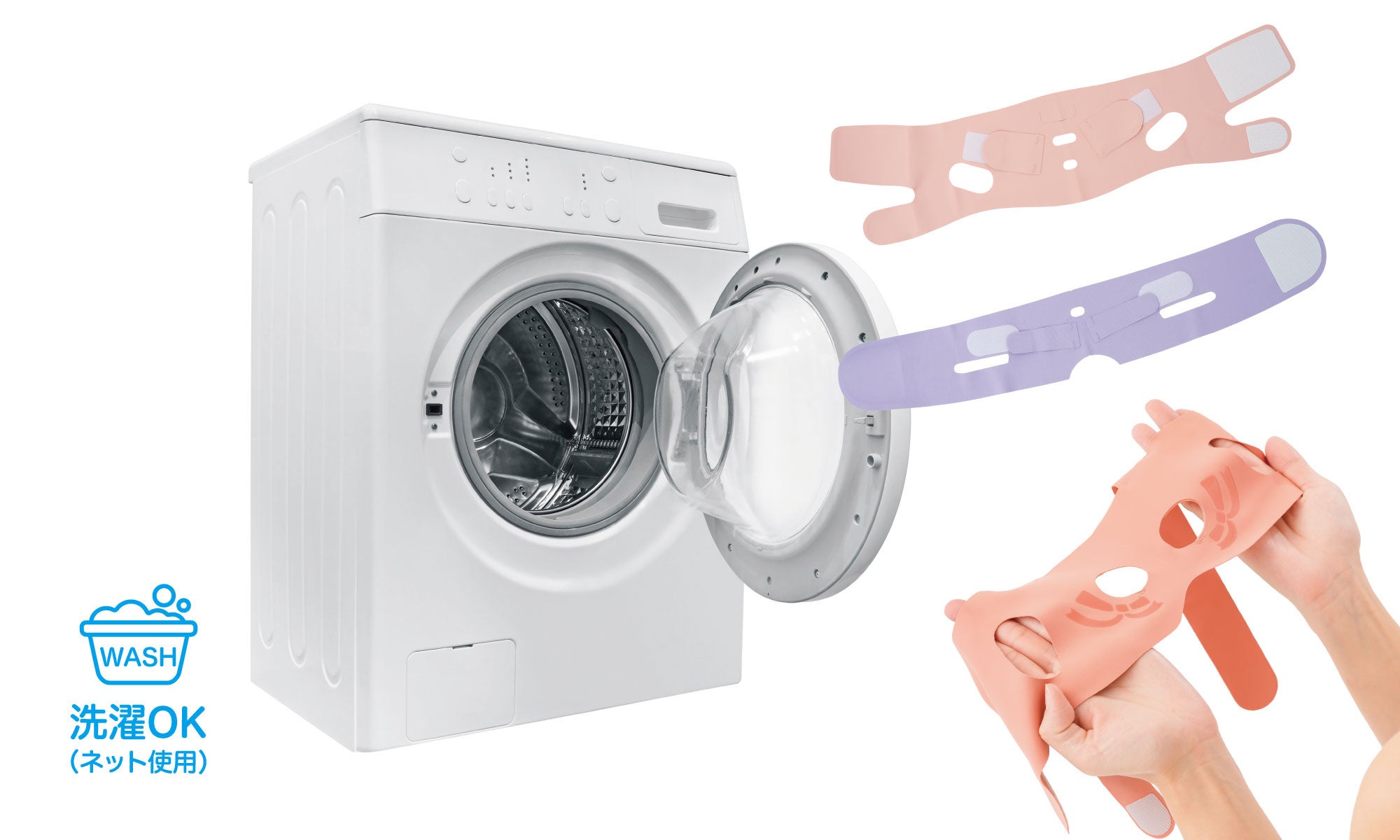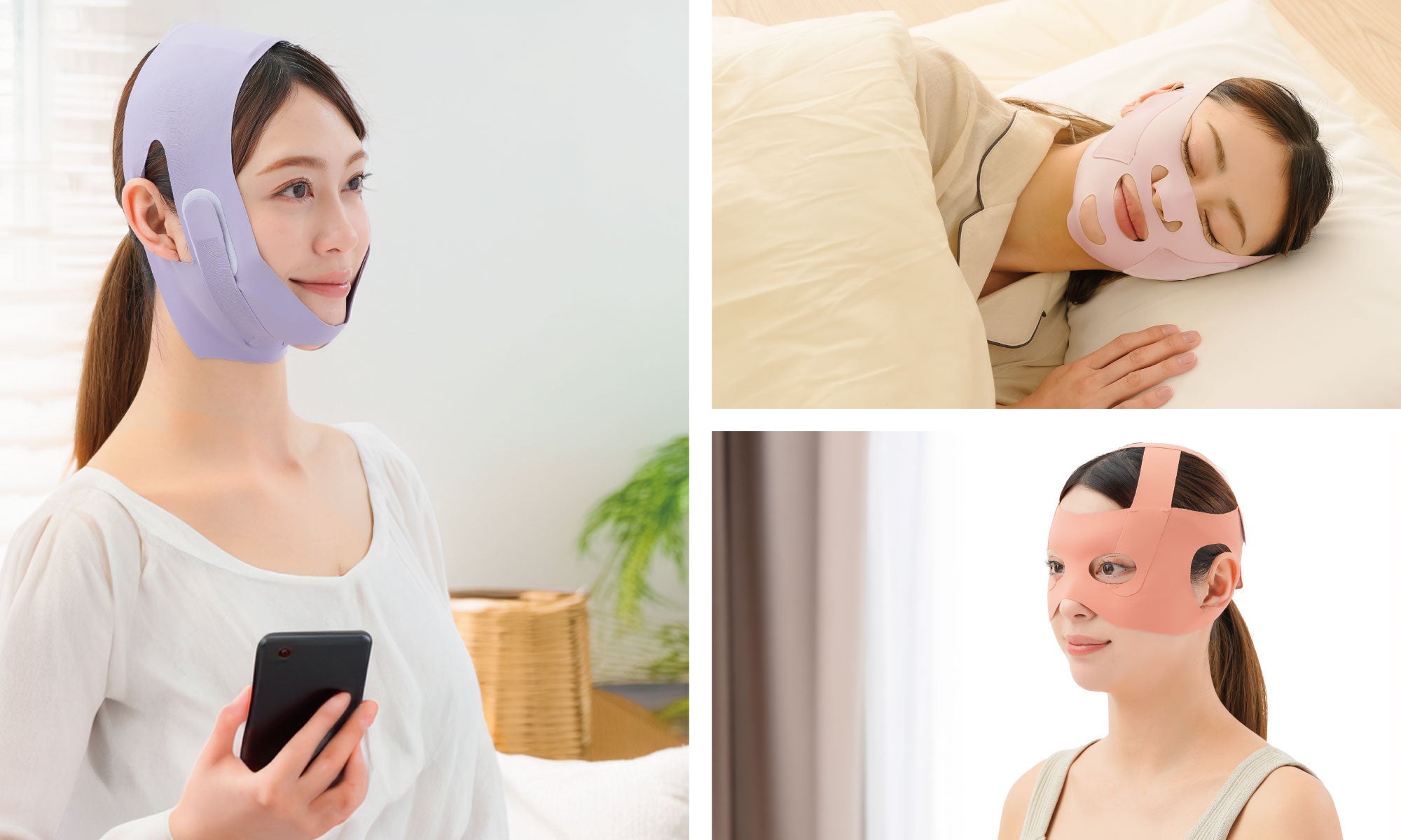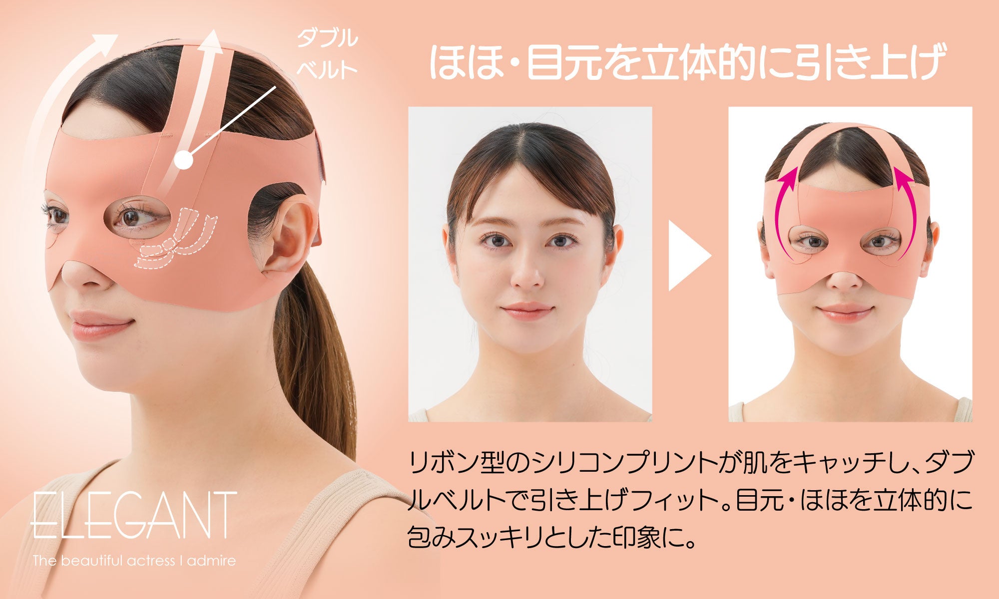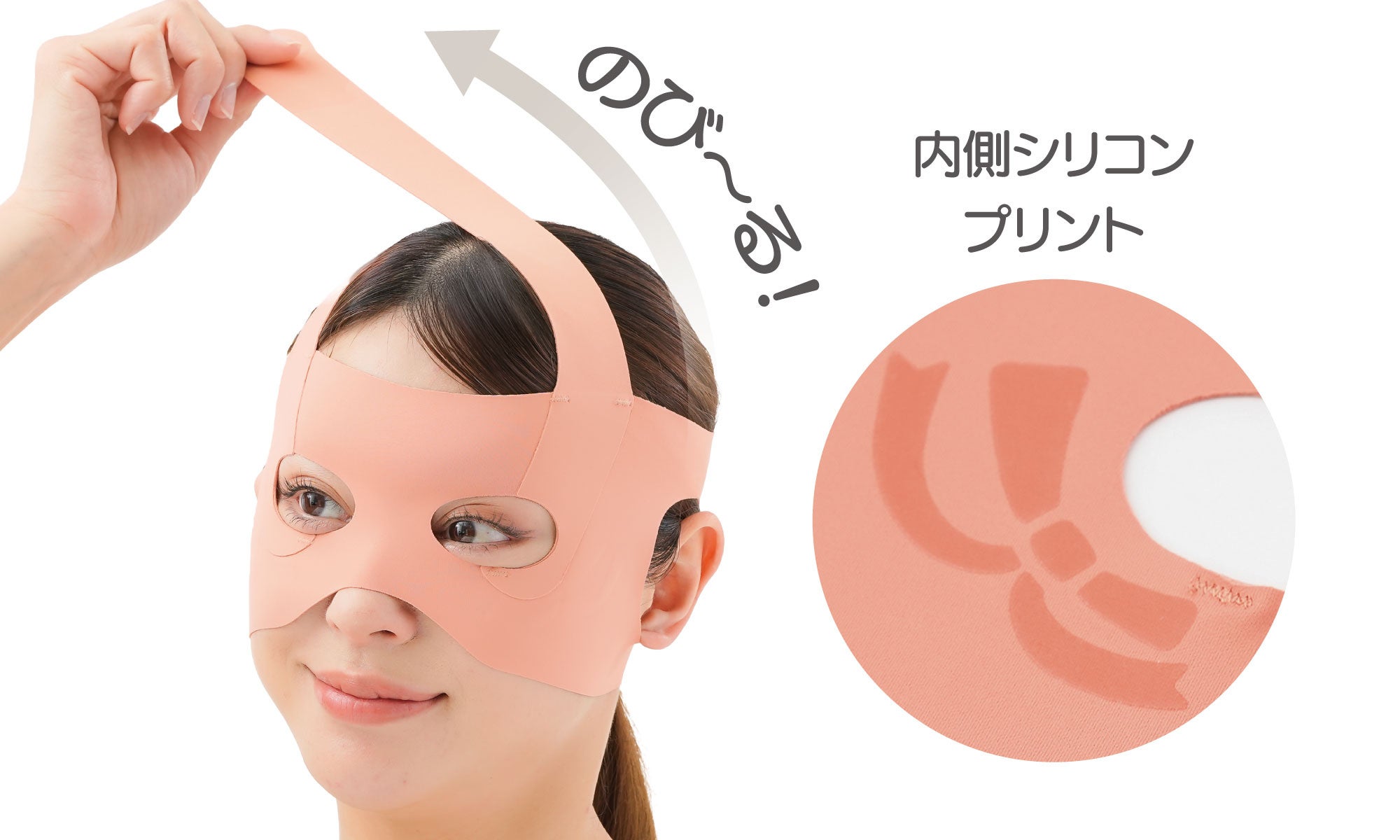 立体構造のリボン型シリコンプリントとダブルベルトでほほや目元をしっかり包み込み、すっきりとした印象のフェイスラインへ。