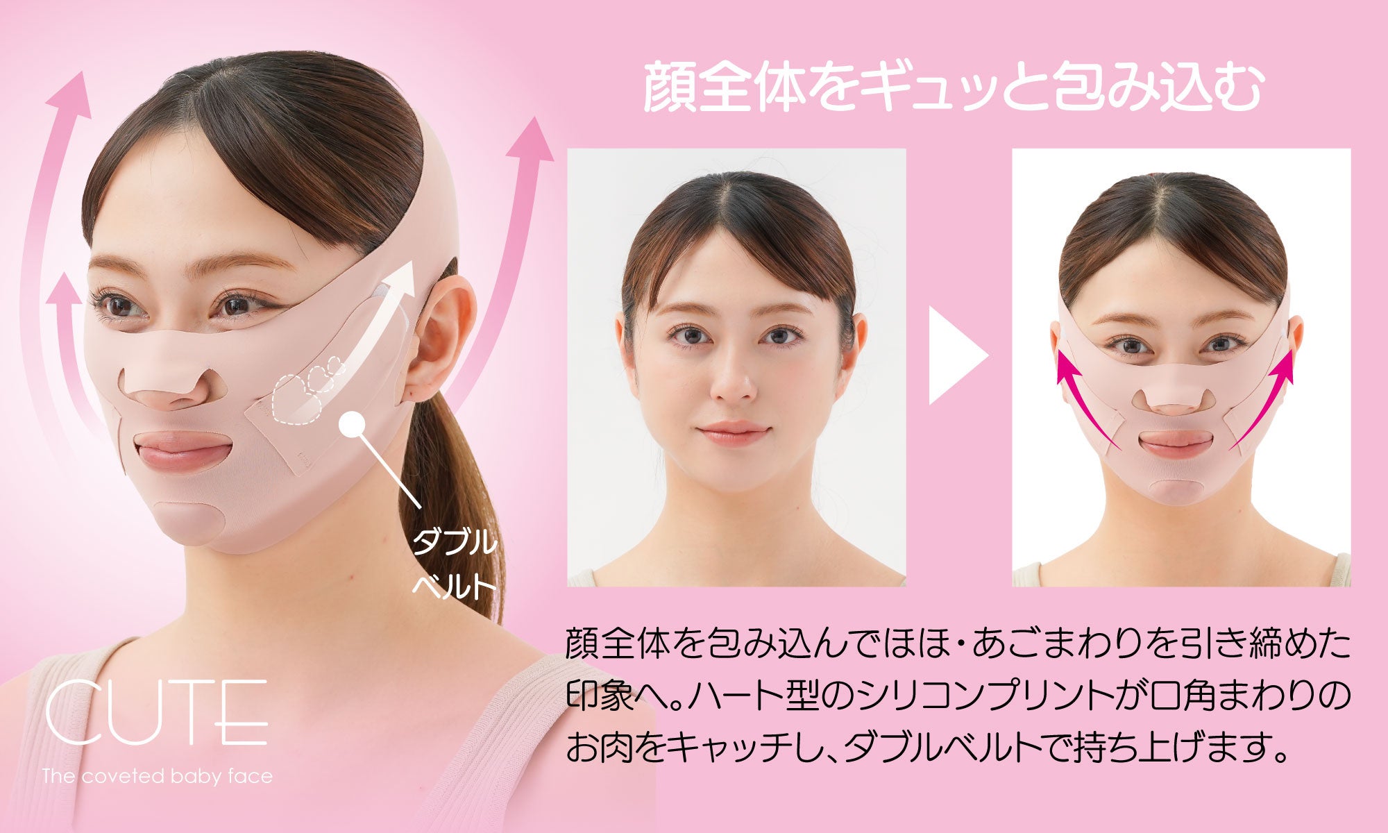 ダブルベルトが顔全体をまるごと包んで引き上げ、全体的にリフトアップすることで小顔を目指します。